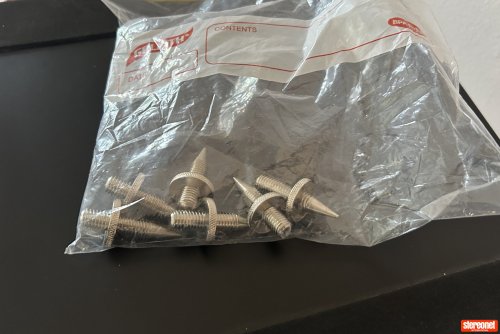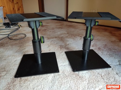 I bought this pair new from a local retailer for my office setup, especially for the tilt function which made it easy to get great speaker alignment. They may not have heaps of WAF but are ideal for a studio or man cave. Comes with spikes.
