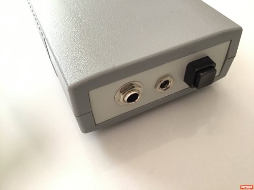 Enclosure is ABS and lined top and bottom with heavy bituminised Al and earthed to form a ground plane and shielding. This makes the amp impervious to EMI/RFI from external devices and damps resonances and vibrations. 6.5mm phone jacks front and back - back is input - with volume control and antique knob. A front LED indicates on. Push button on/off switch at back.