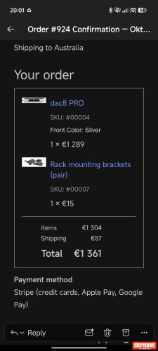 Users report solid, compact construction with a nice screen, balanced XLR outputs, headphone amp, volume control (works with Apple remote), and features like 8-channel sync, USB/AES inputs, and customizable output levels. Stereophile notes "almost no compromises" in squeezing 8 channels into a slim chassis. European (Prague) design and manufacturing earn praise for quality and value.