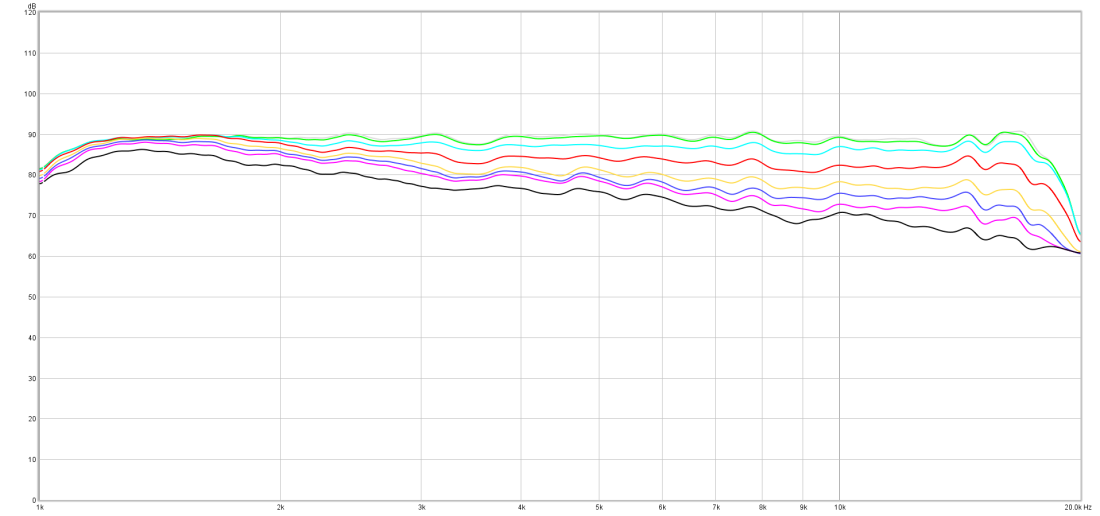 This is showing the off axis response of the tweeter and compression driver. Each line is a 10 degree increment, so you can see that at 30 degrees, at the nominal 60 degree total beamwidth, we have constant directivity above 3k. 10 degrees is very close to on axis. 20 degrees and 30 degrees steps down but the trend is fairly flat. This is showing only the tweeter with just one broad parametric filter to flatten out the response. You will notice that some peaks and dips are consistent with angle yet others change off axis. We use this information to decide how to correct the axial response. If we only look at the axial response, we'll make bad decisions.