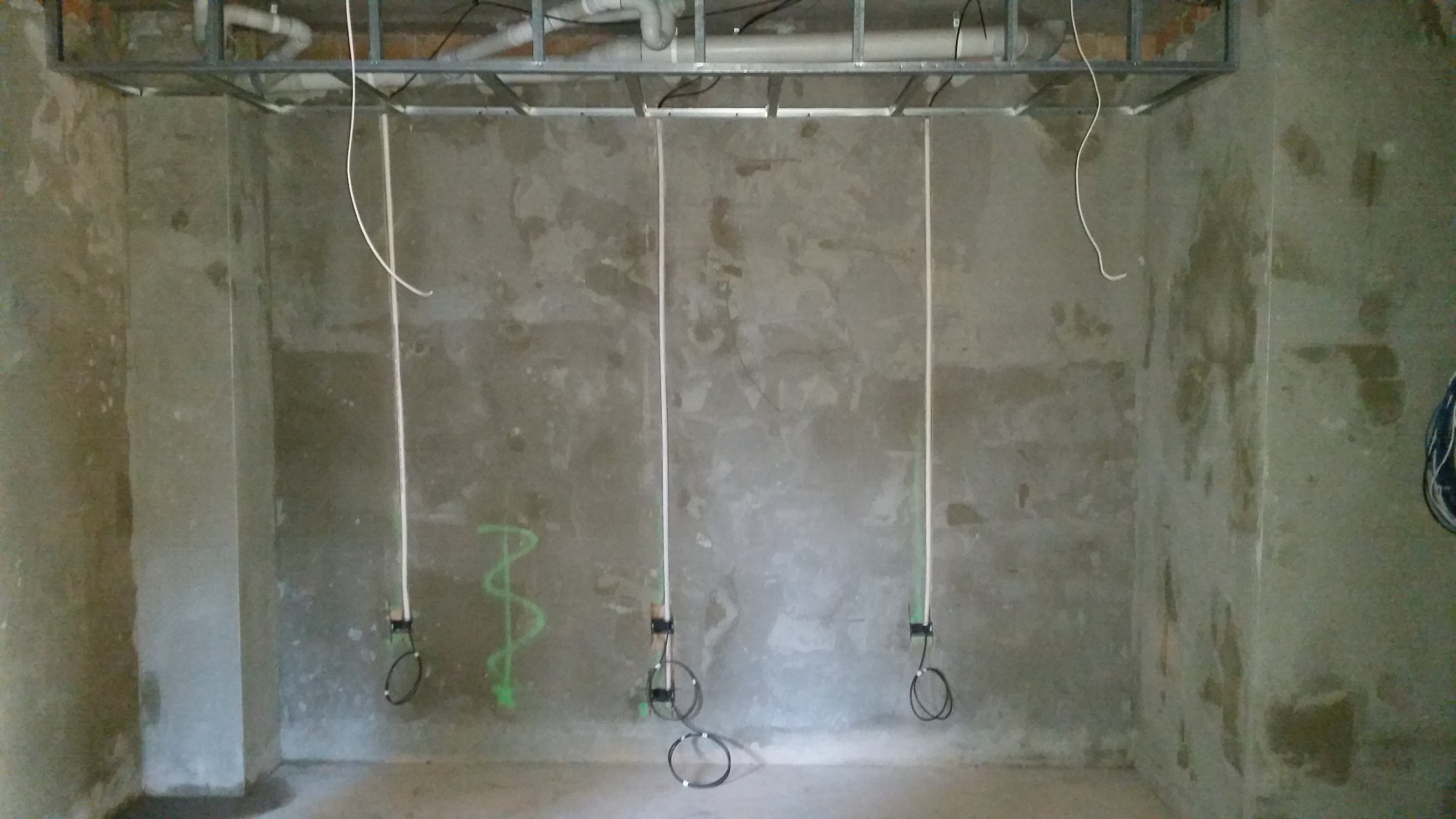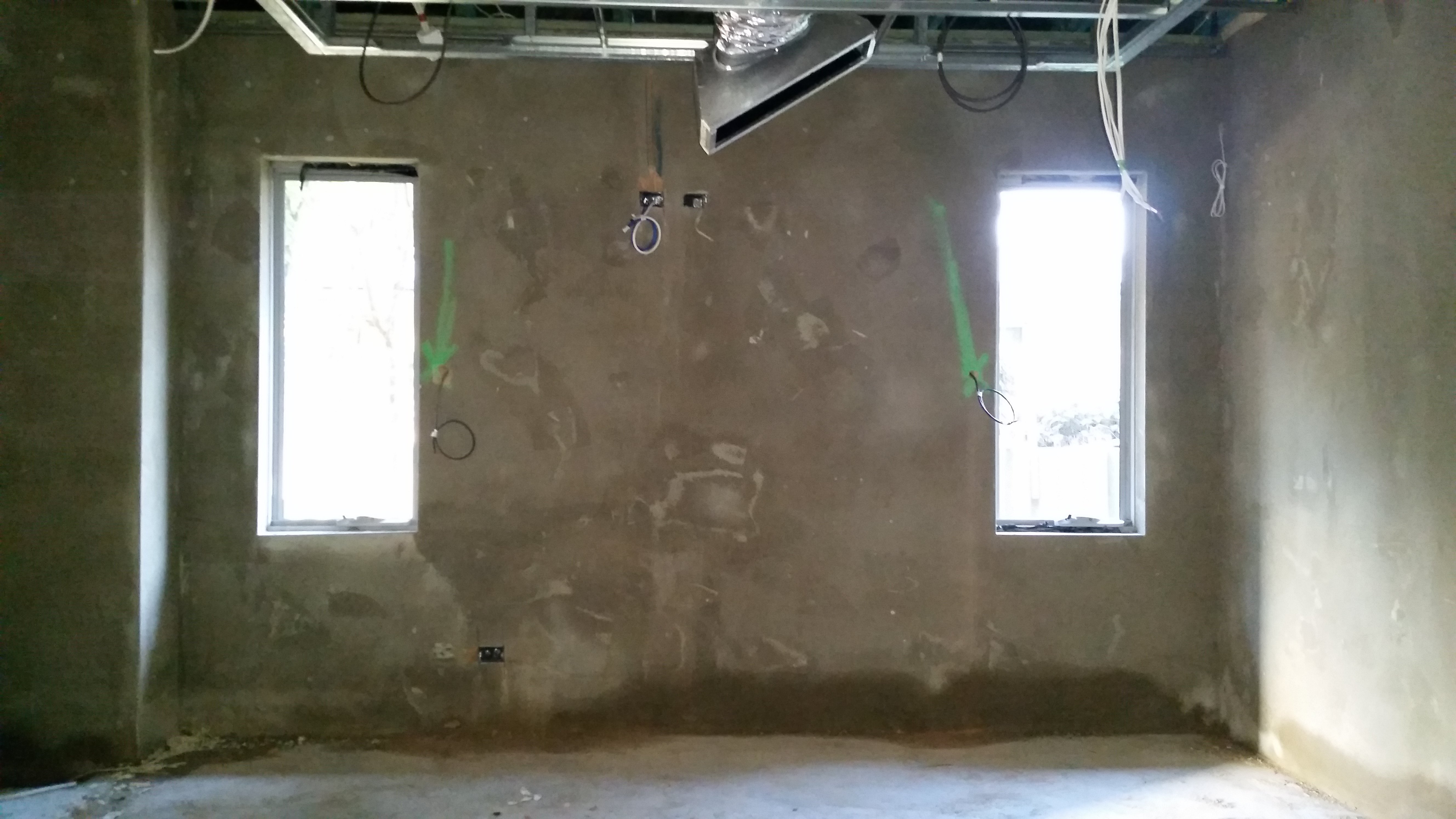 Rear wall with awning style windows. You can just see the reverse bulkhead, A/C duct and cabling. At the top middle is HDMI, CAT6 and wall plate power. The bottom leftish of photo is wall plate for power and Sub2