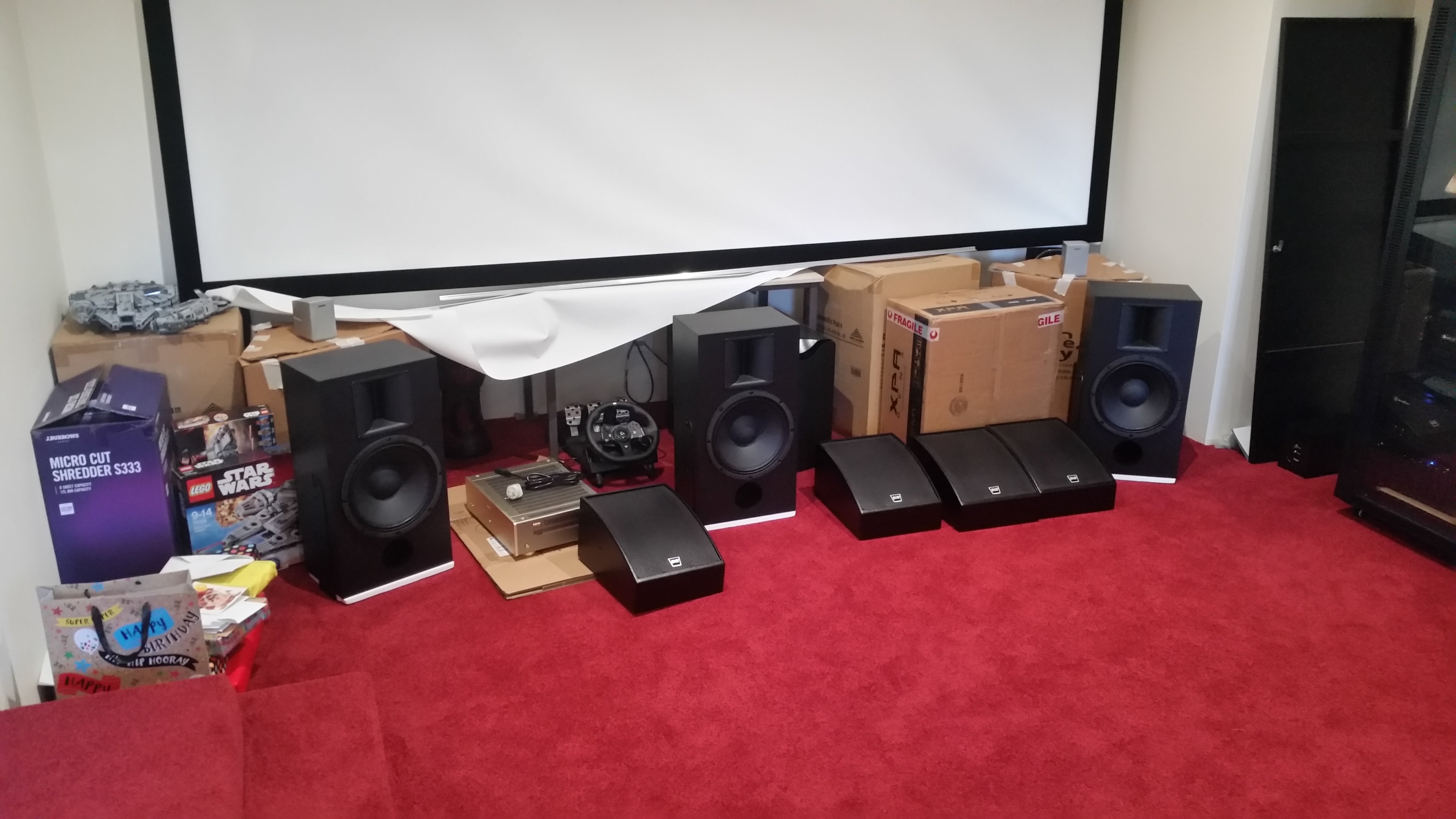 Speakers and screen in temporary setup.