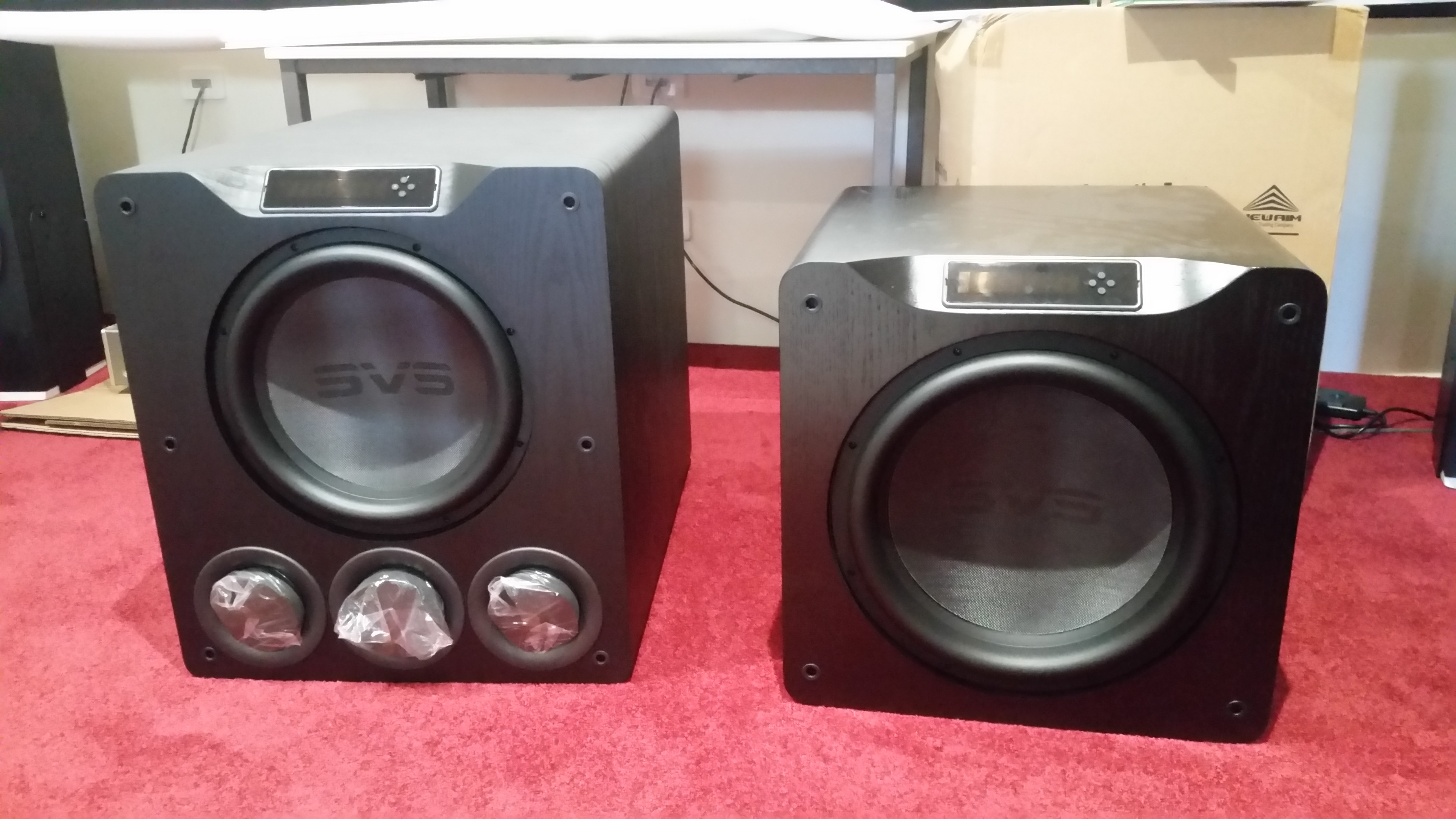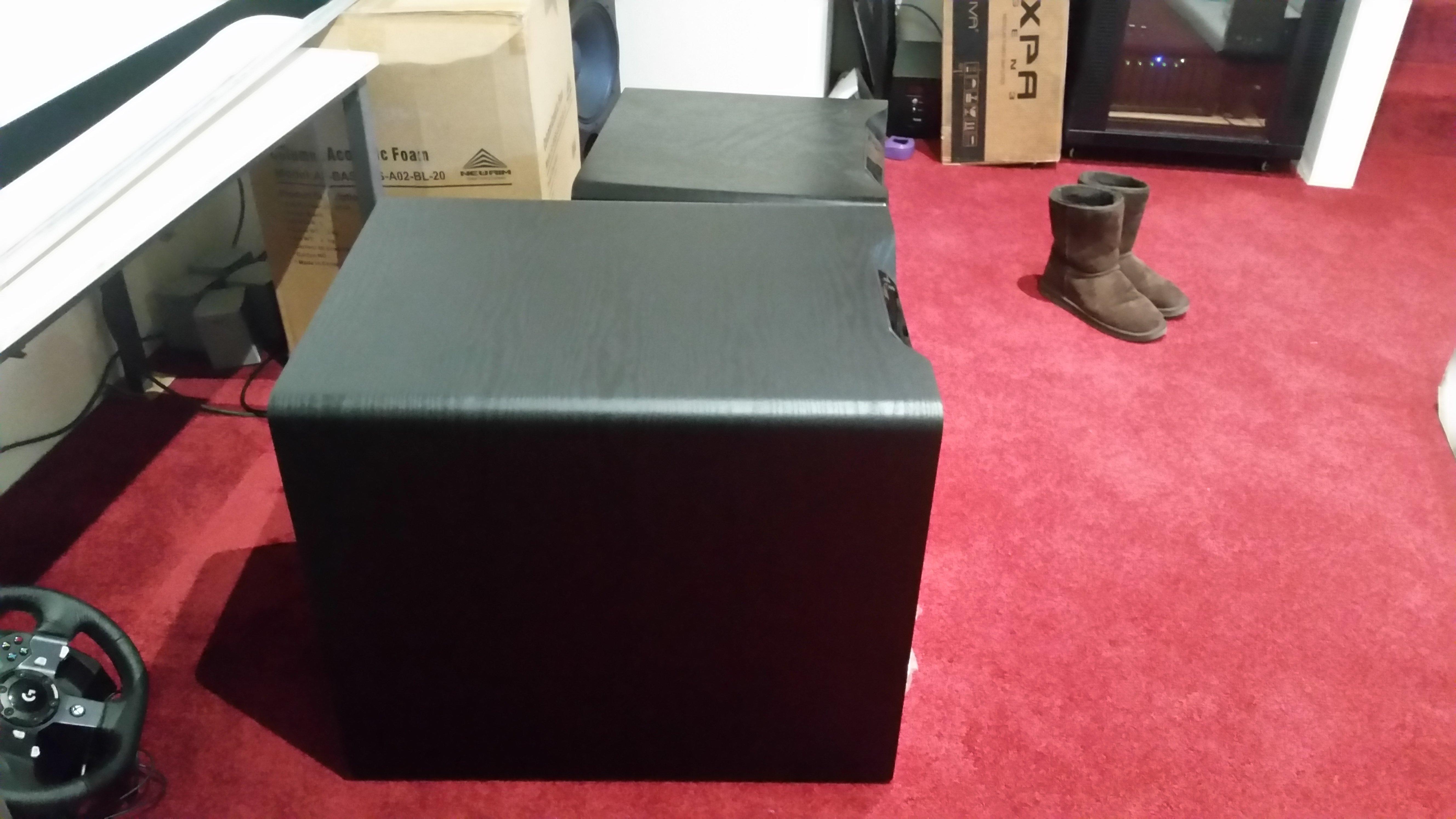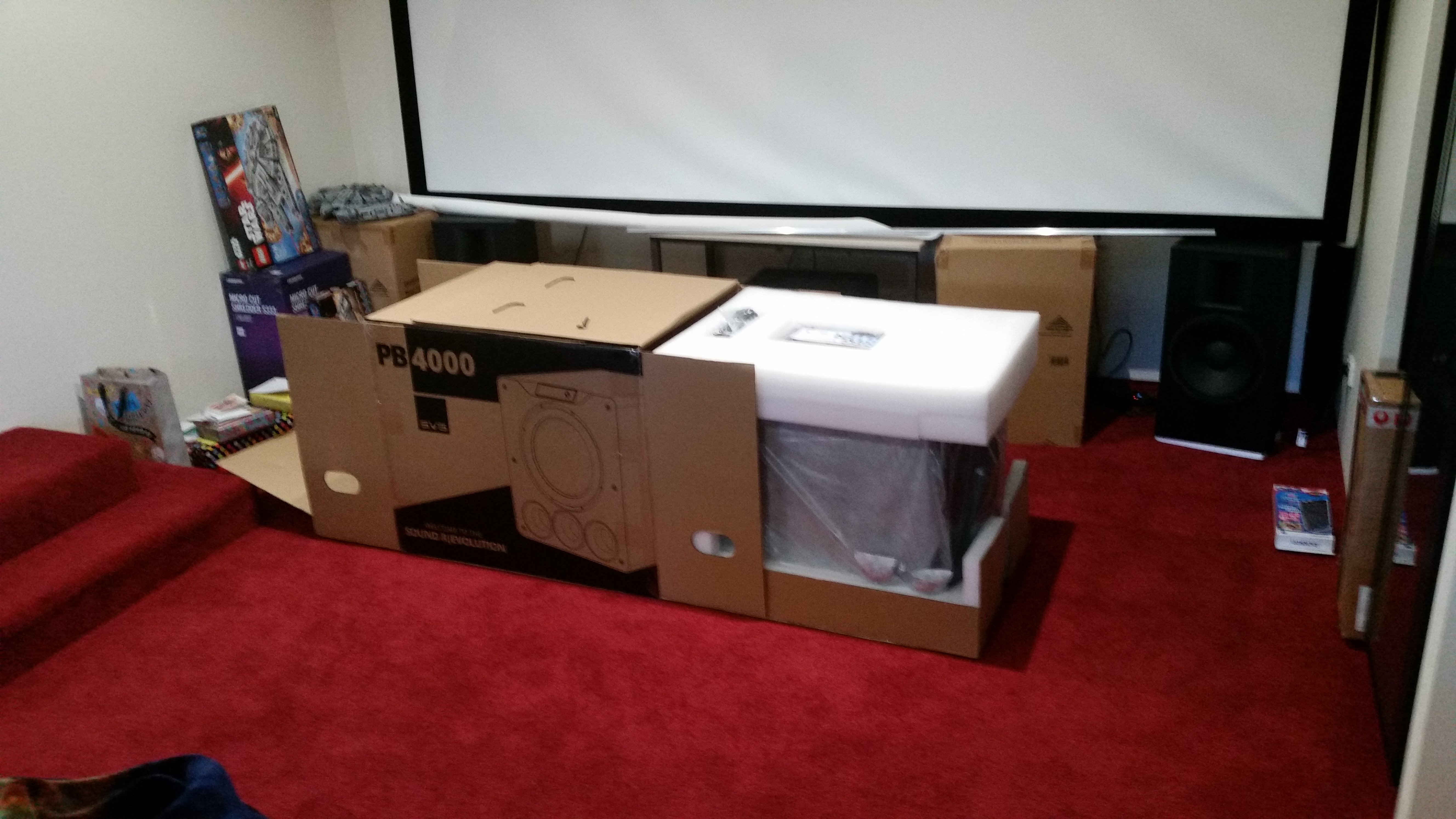 Unboxing SVS sub. I had a bit of trouble but I managed to wrangle this thing by myself into the room. The carpet helped.