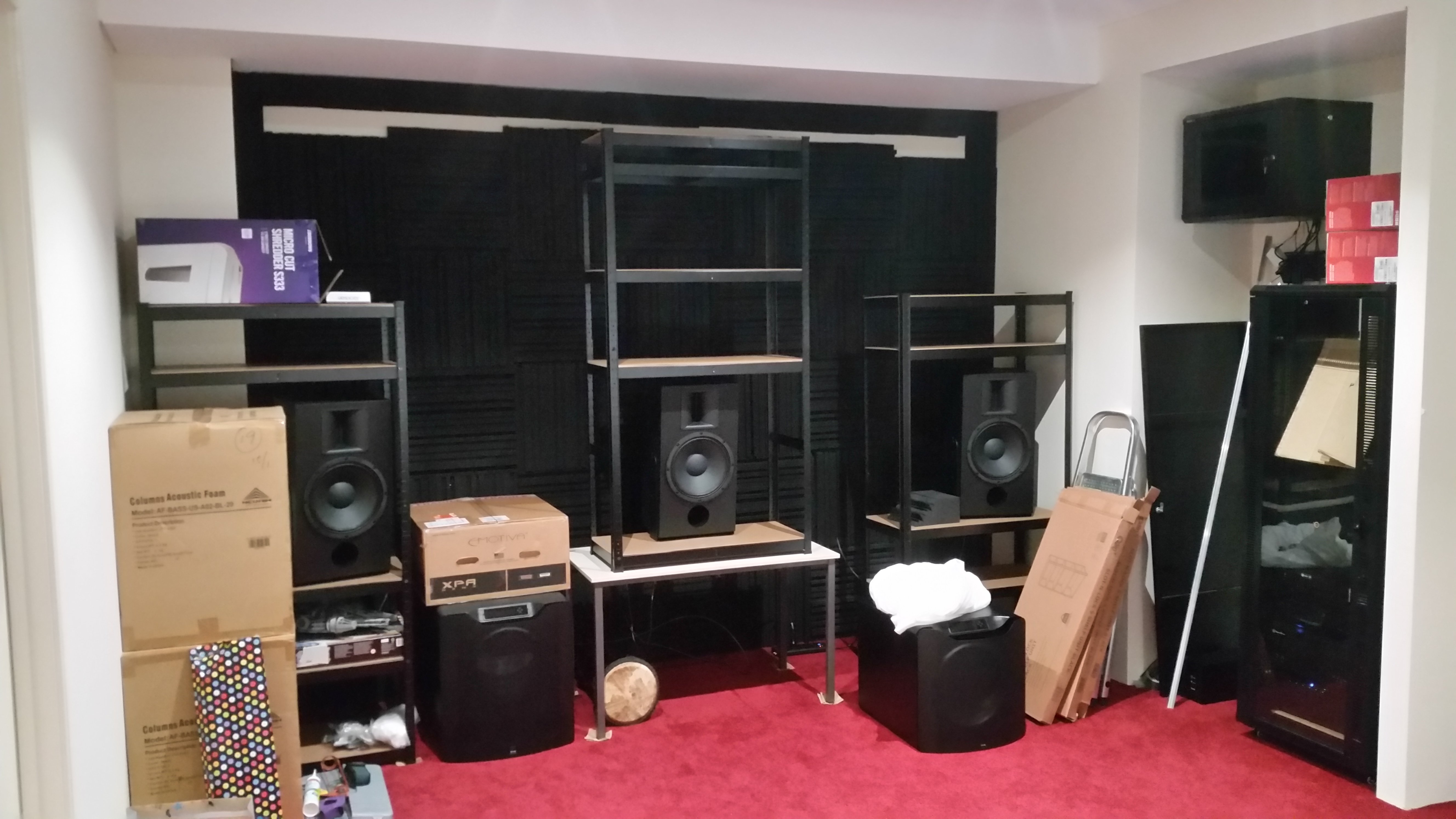 DIY front wall treated with elchepo 'acoustic foam'. Speakers elevated with elcheapo stands.