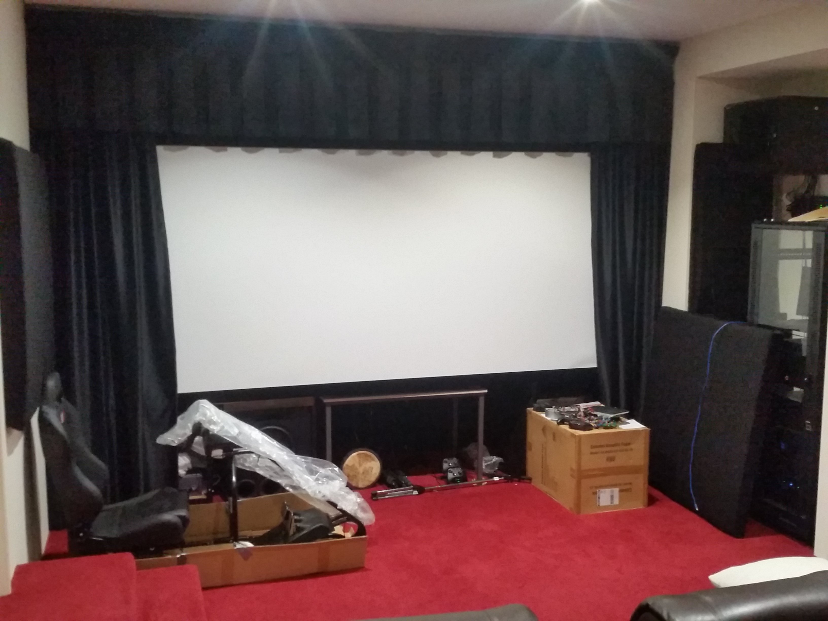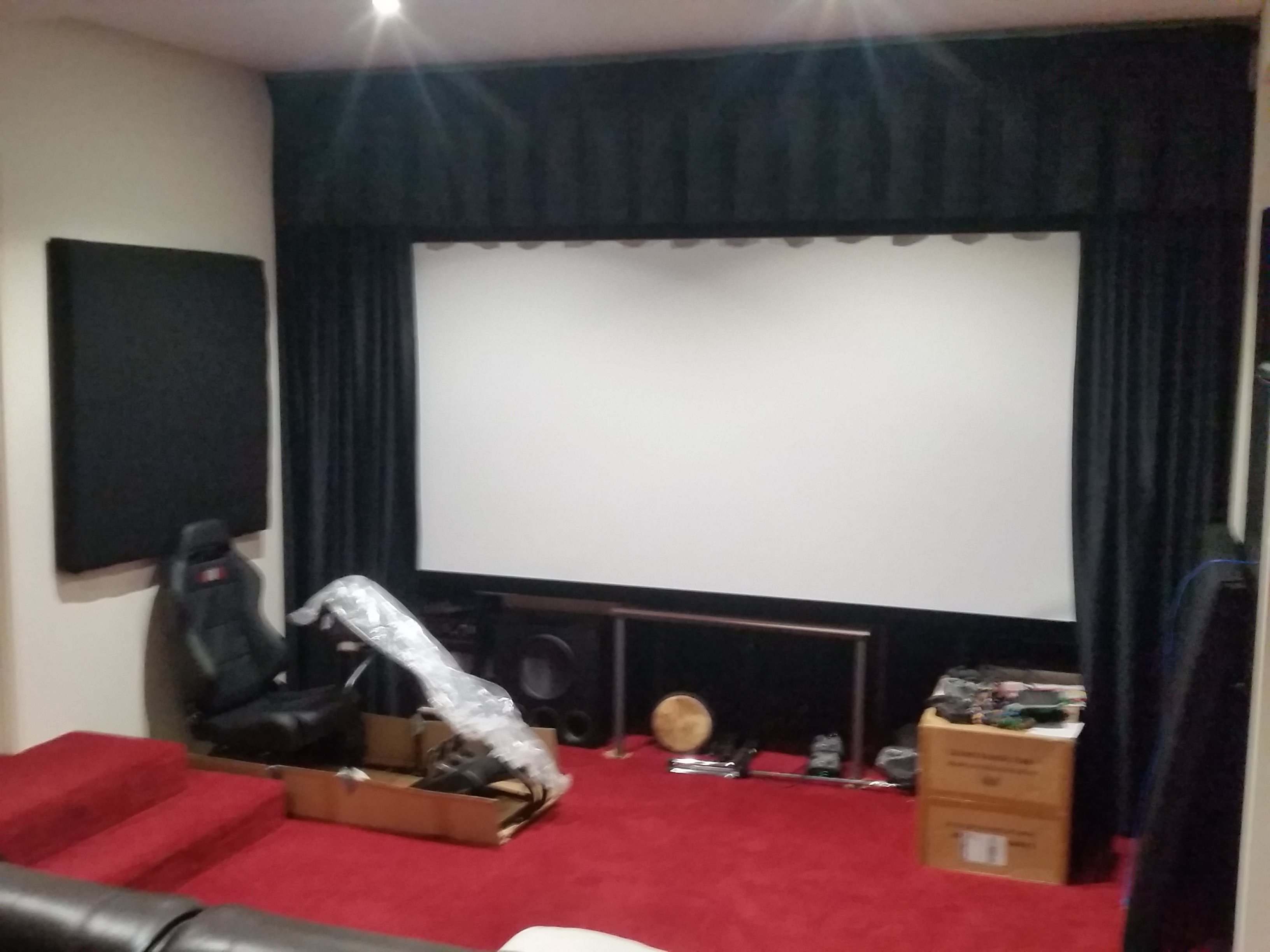 I considered many bulkhead designs and opted for a drop bulk head at the front to allow some plumbing from upstairs to route through, and also allows an area to mask and hang curtains. This then gave me room to put speakers (and junk) behind an AT screen.