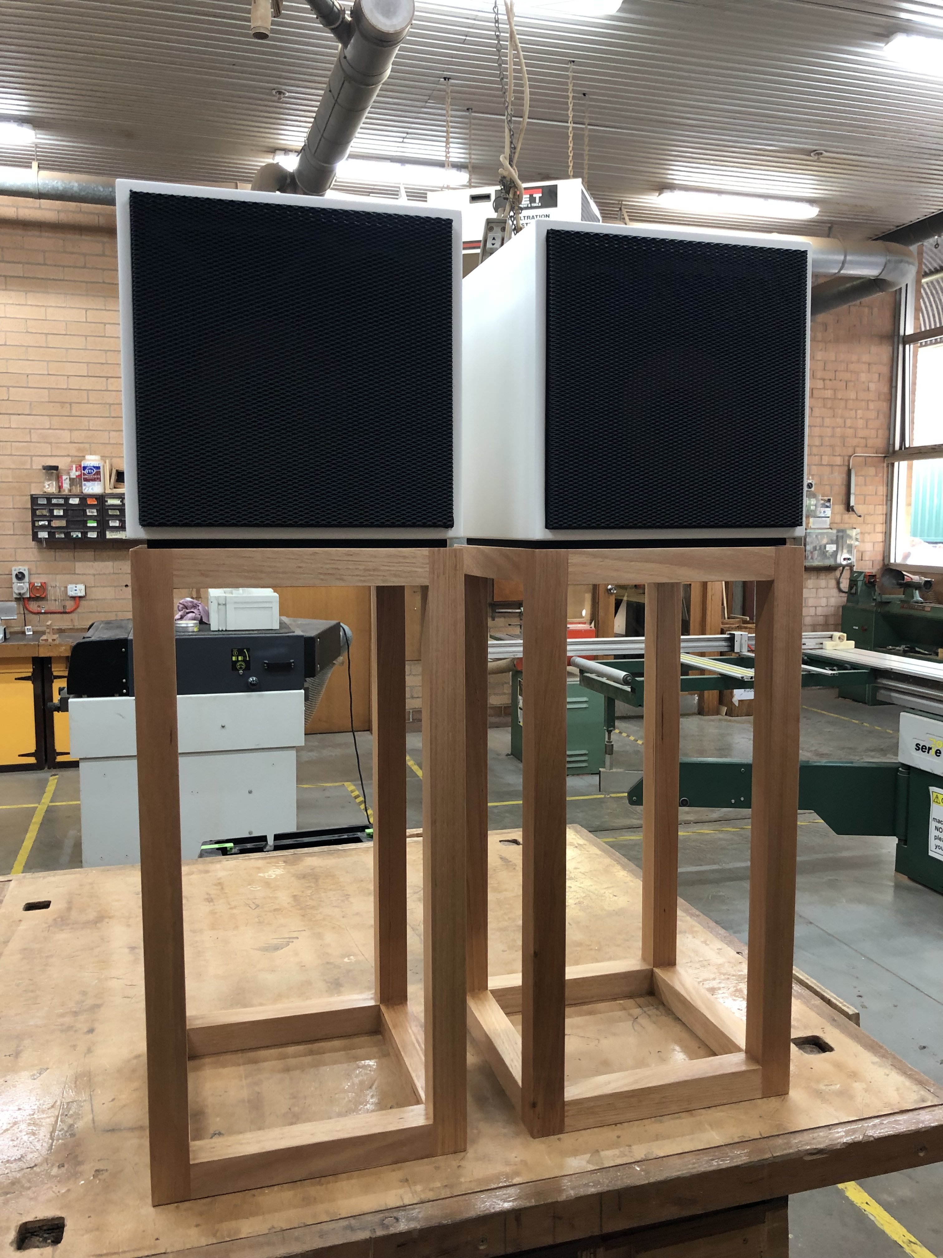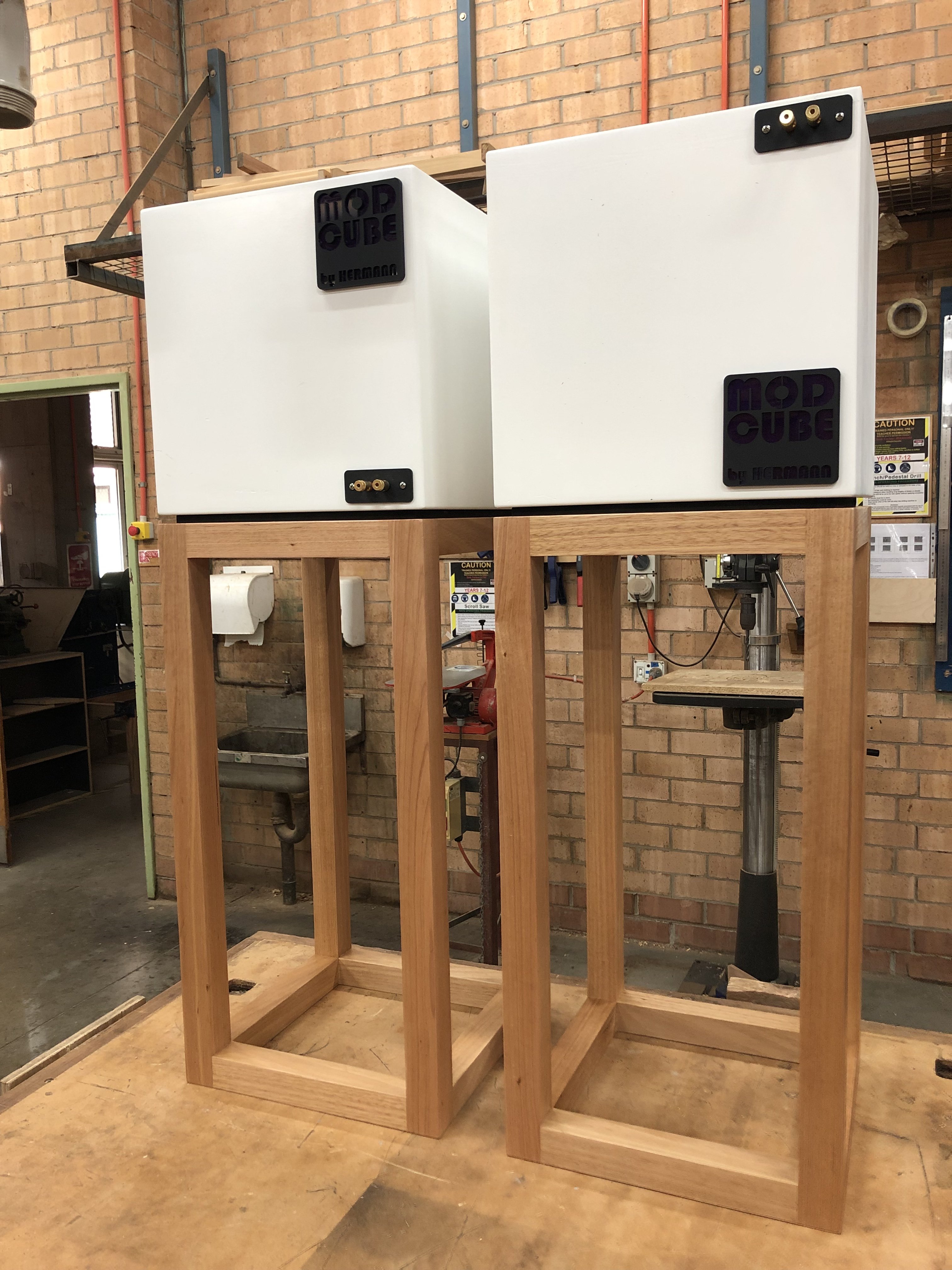 Been faffing around for awhile now with some speakers I bought here on Stereonet for my daughter. They were ‘Mod Cubes’ by Hermann that I purchased from Steve @Alpine Electrocats. (If anyone has more info on provenance of these I’d be interested!) I’ve sprayed the cabinets satin white, sprayed the grills, made up some terminal plates and put on new terminals and laser cuts some badges that I felt suited the ‘Mod Cube’ aesthetic! I have just finished some stands out of Tassie Oak and added a MDF spacer that I glued to the base of each speaker so that they can’t slide off the stands. (Two square pieces of 10mm MDF painted black) Will bring home from work this weekend and hook up to her Sansui Au-101. Will play from her phone.....
