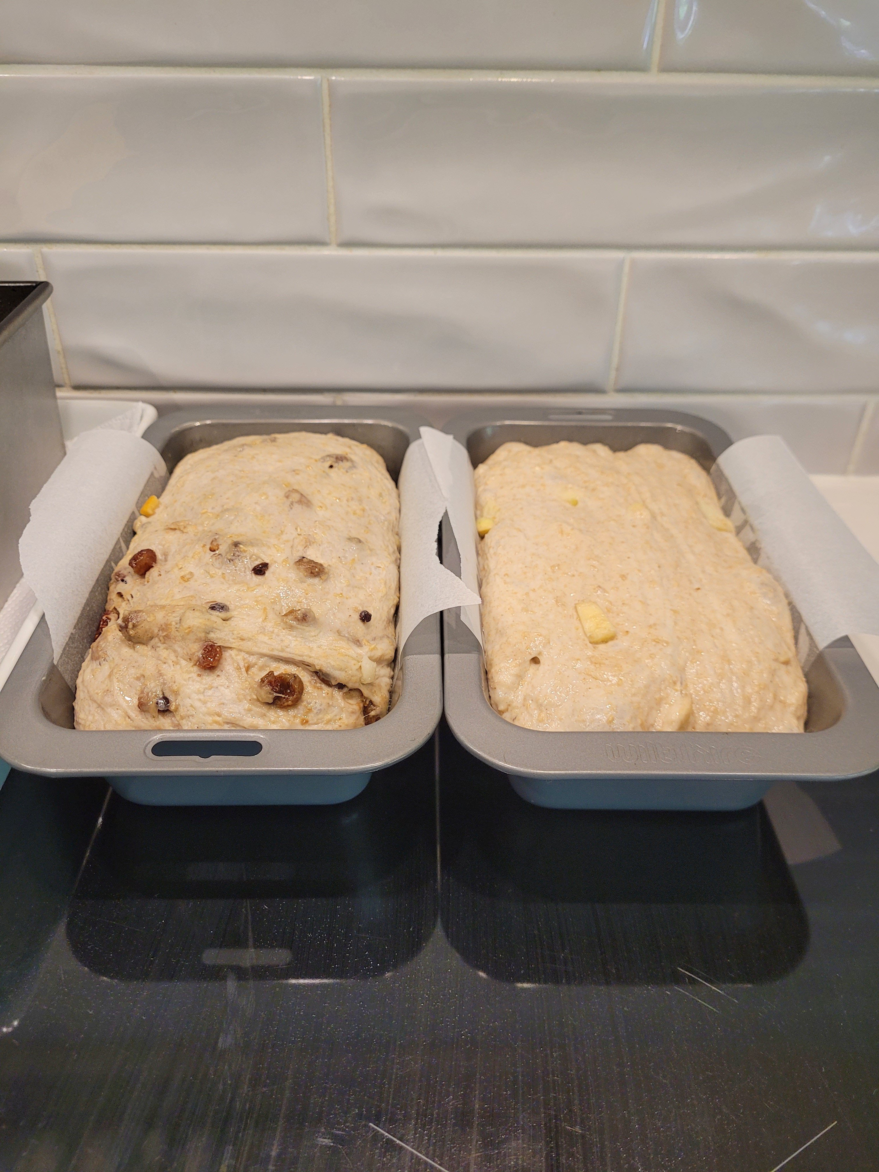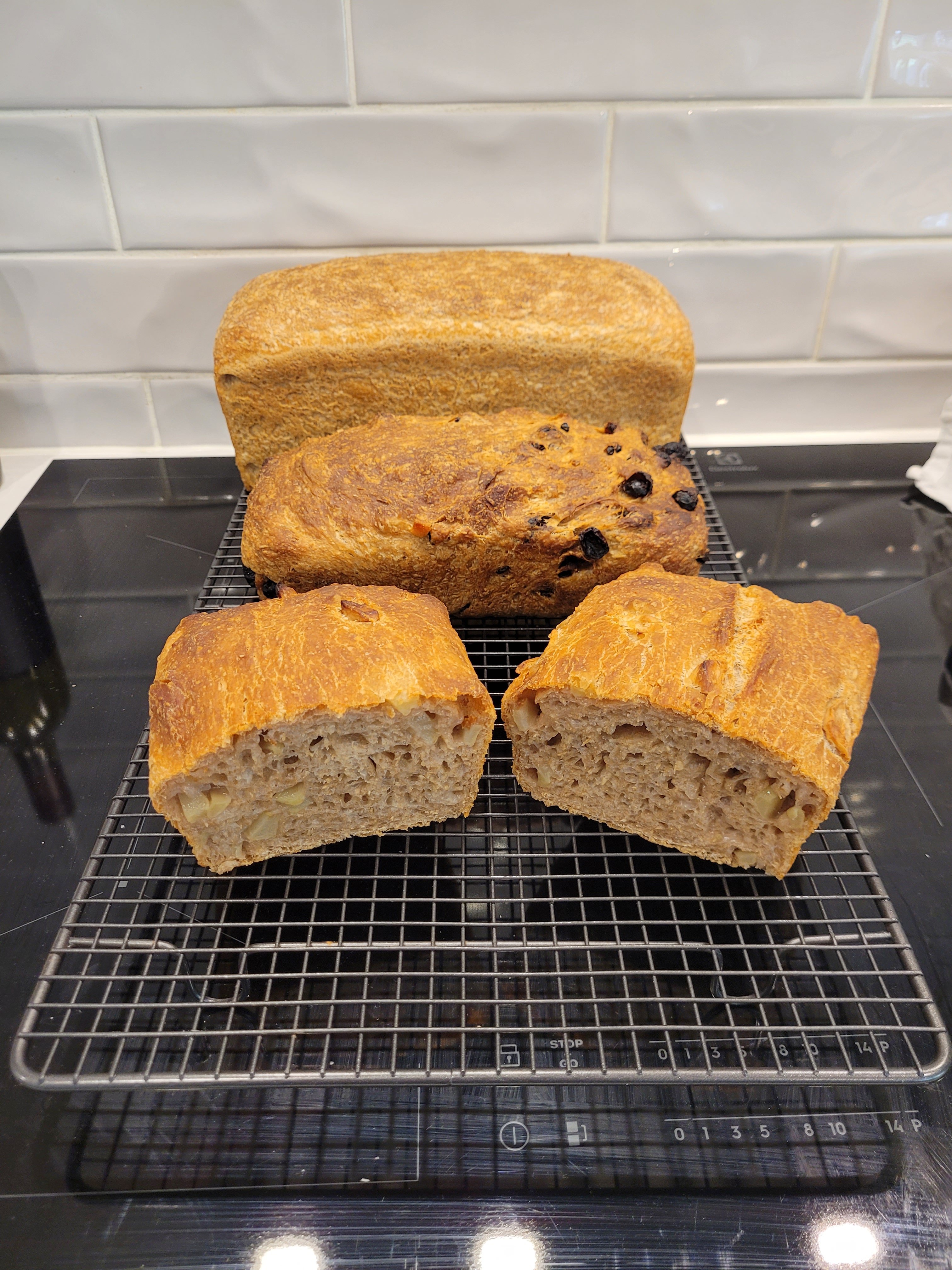 This weekend saw some more experimentation- full wholemeal loaf with a touch of rye then another batch the same, split in two before fermentation. 1 loaded up with mixed fruit and a dash of allspice, the other with a couple of chopped Jonathan apples with a hint of cinnamon, and a bit of sugar in each. Both turned out quite well I reckon, taste largely!!