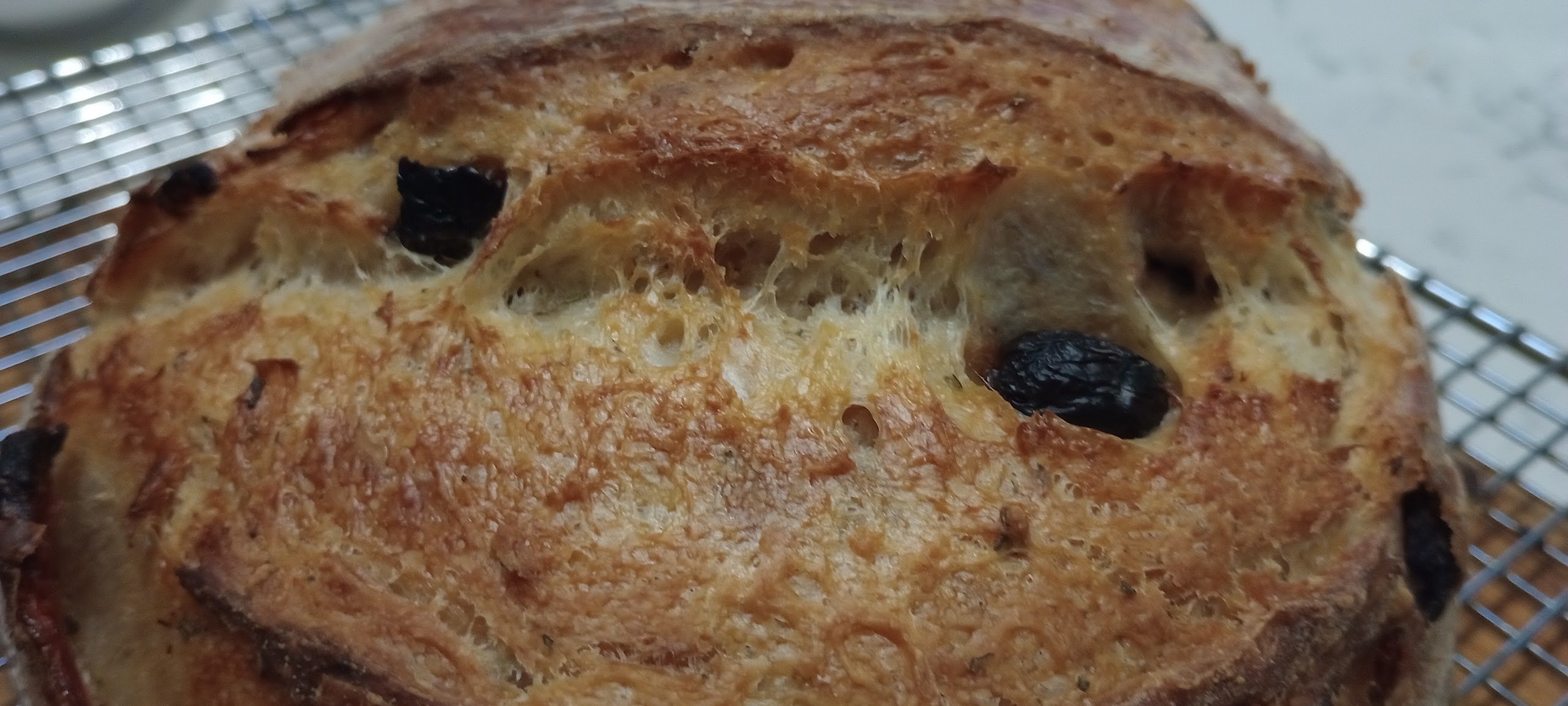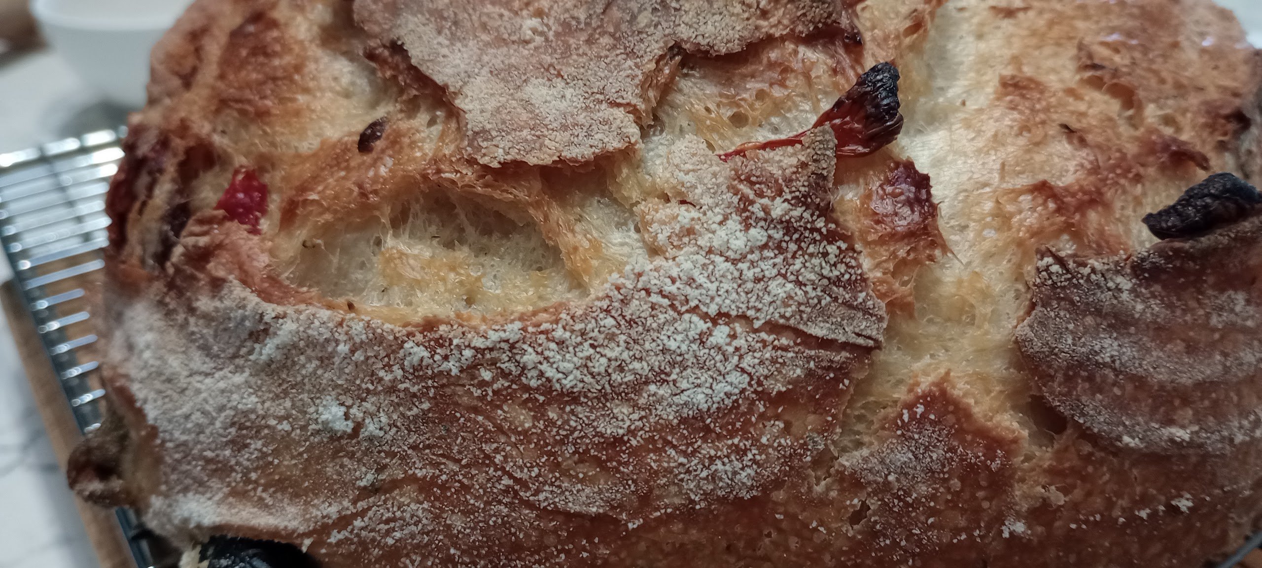 This is a four olive bread with roasted capsicum. The olives are green Sicilian, dried and salted black olives from Türkiye(oh yum they are), a friends locally grown and fermented Olives(yuge buggers the size of quail eggs) and good old Kalamata.