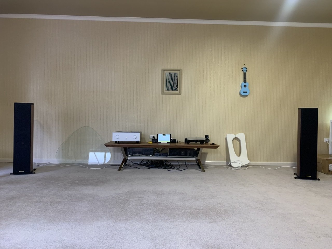 The listening room has evolved over time, but has loads of absorption, PSE144 horn top end with stereo TD18 mid bass underneath and a single large sub (2400 x 600 x 300) that my wife calls the "coffin box".
