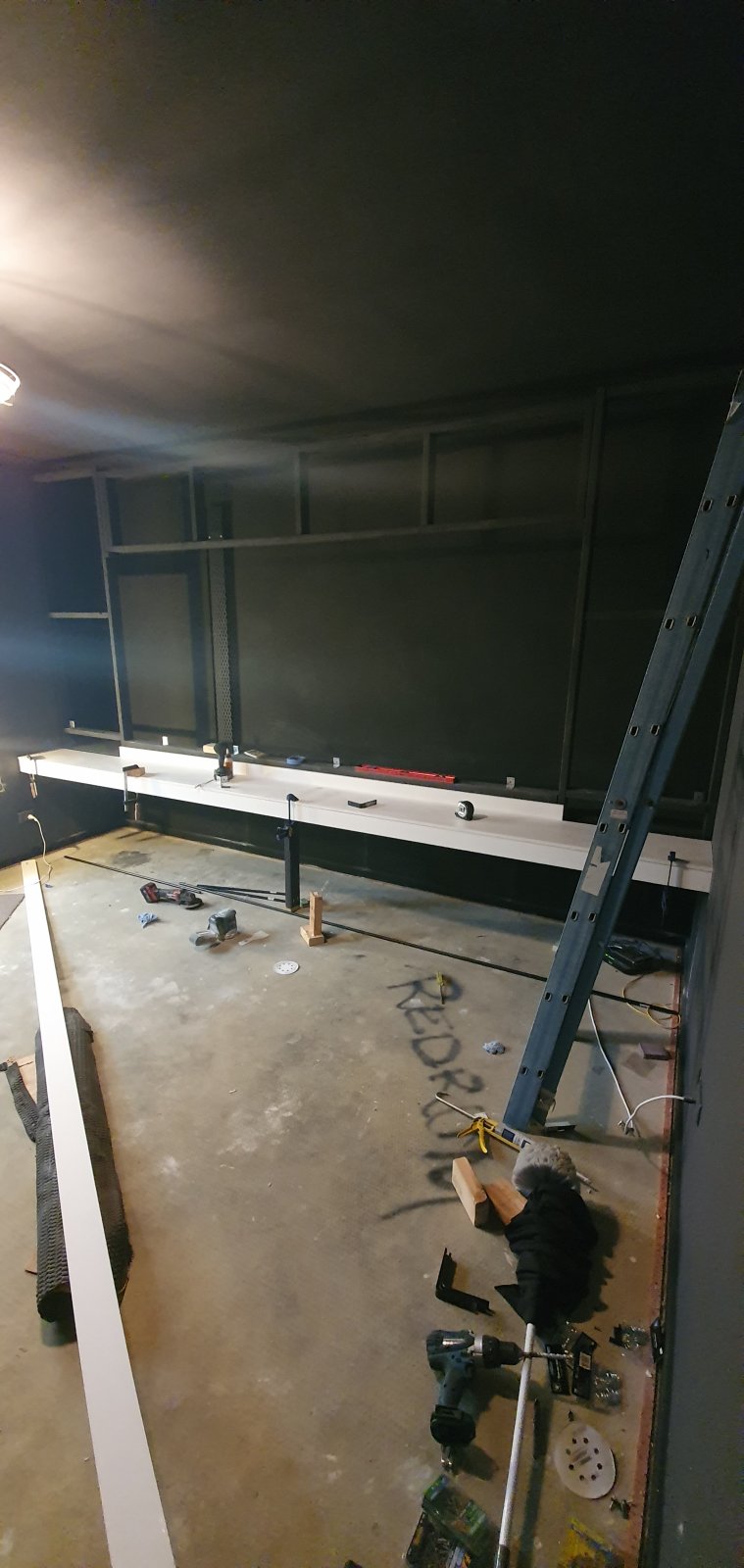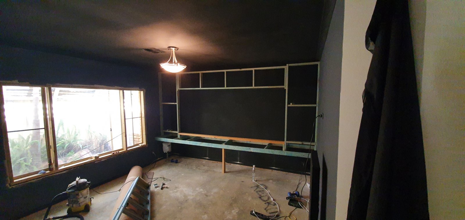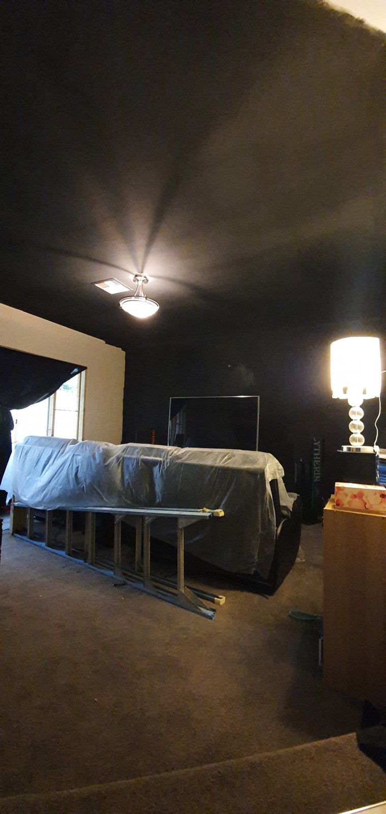 • Painting has started. We went with the dulux home theatre black for the front wall and ceiling. It looks really good, but I've heard its a nightmare to keep cleans. So I didn't want any of the walls t