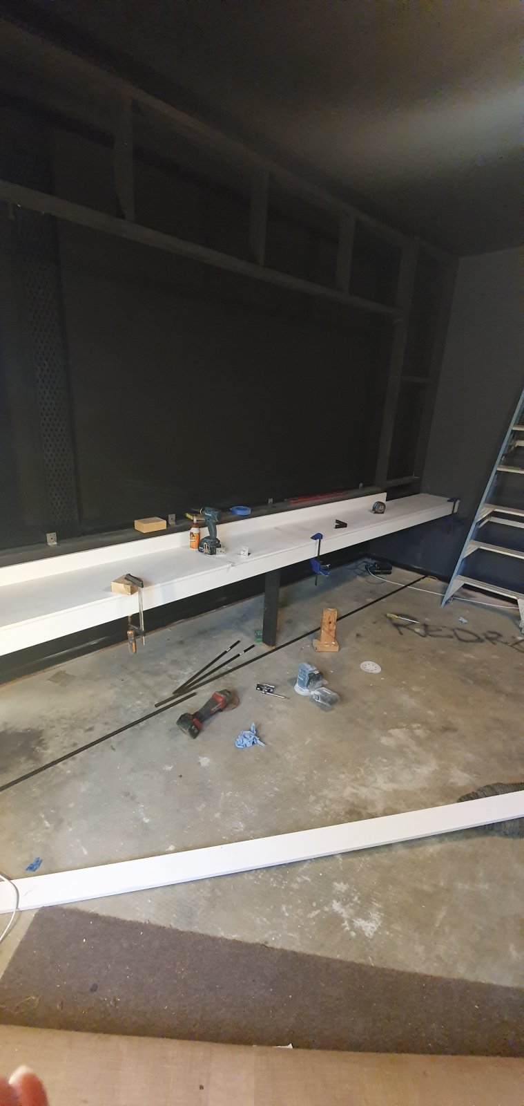 • Bench tops at the front and back of the front stage are now done, ready for paint.   Curtain box and rods installed on lower section.    Projector mount installed on back wall.