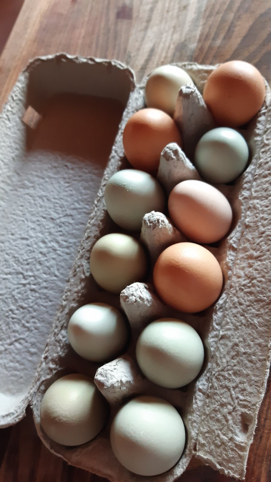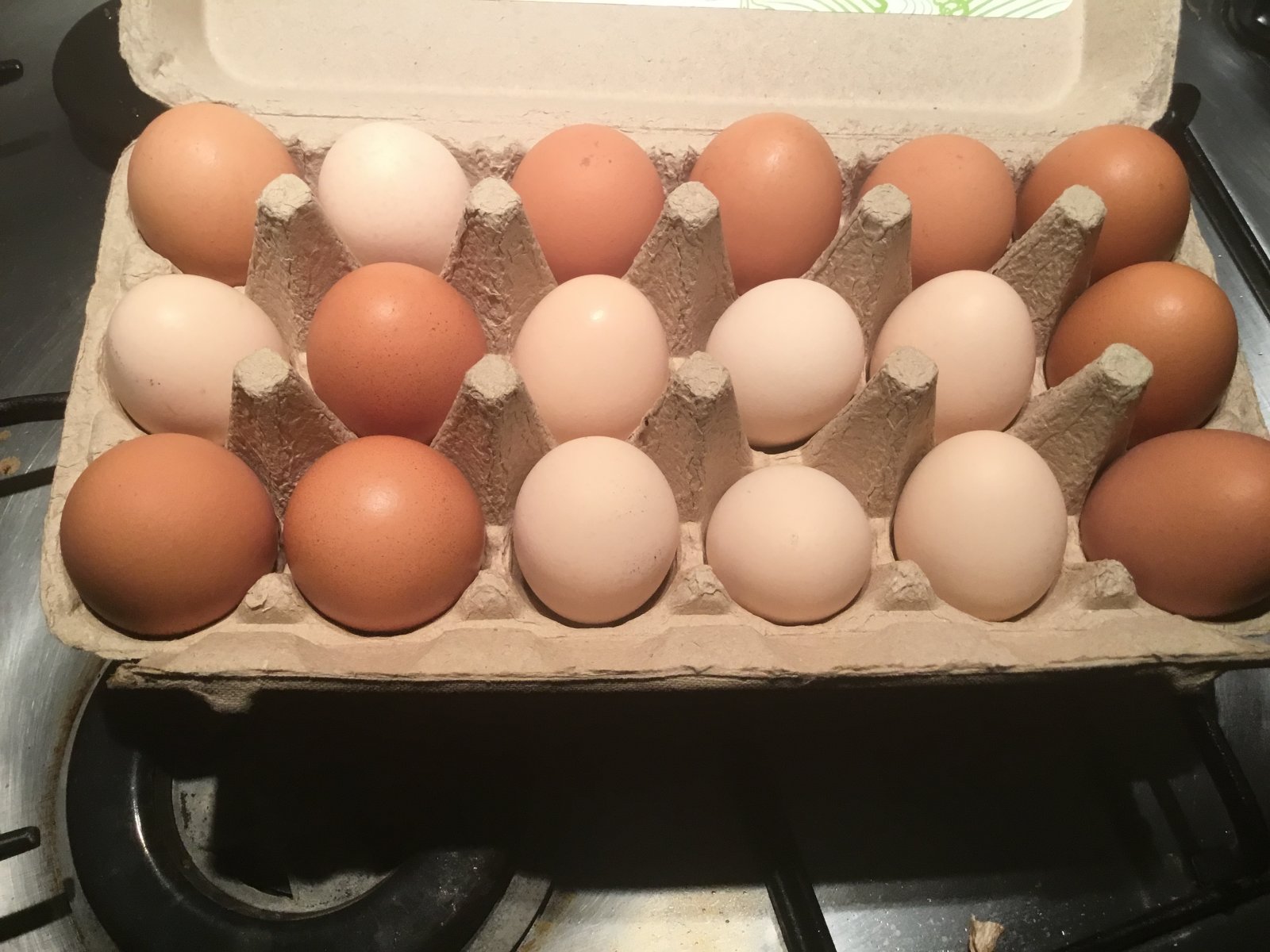 Wonderful to see he must be running a range of different chooks.  A couple of whoppers in there! We find that each of our girls produce very different eggs, even if the same breed. Some lay bigger eggs, darker or with a more course shell. You can always tell which egg belongs to which bird. They also have their own unique flavour as well. Enjoy!