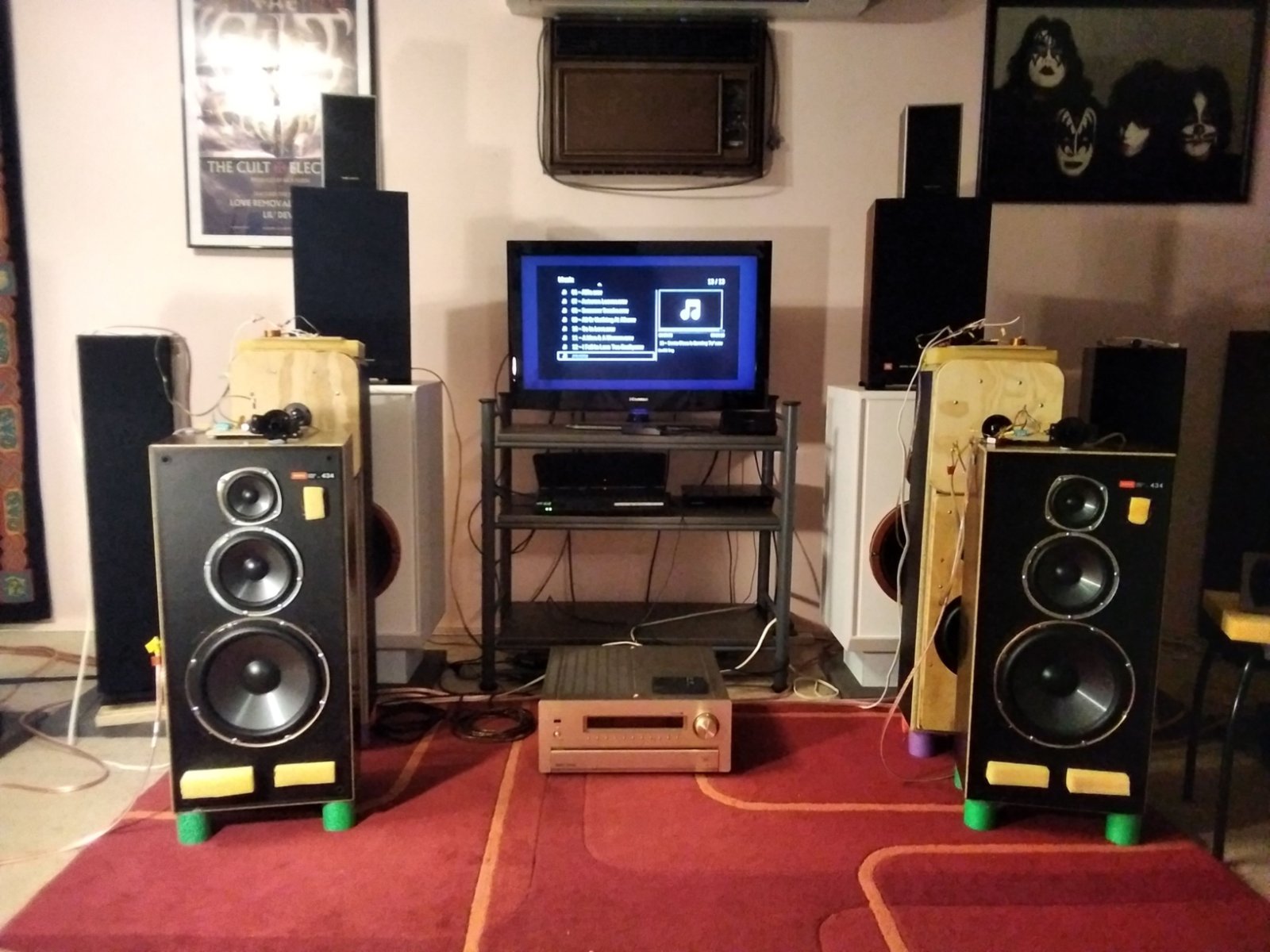 This is a Sony surround system I bought out here for $50, with the Optonica speakers sitting on the subs...  It's also been bastardised, and the cabinets re-used for other drivers and combinations.