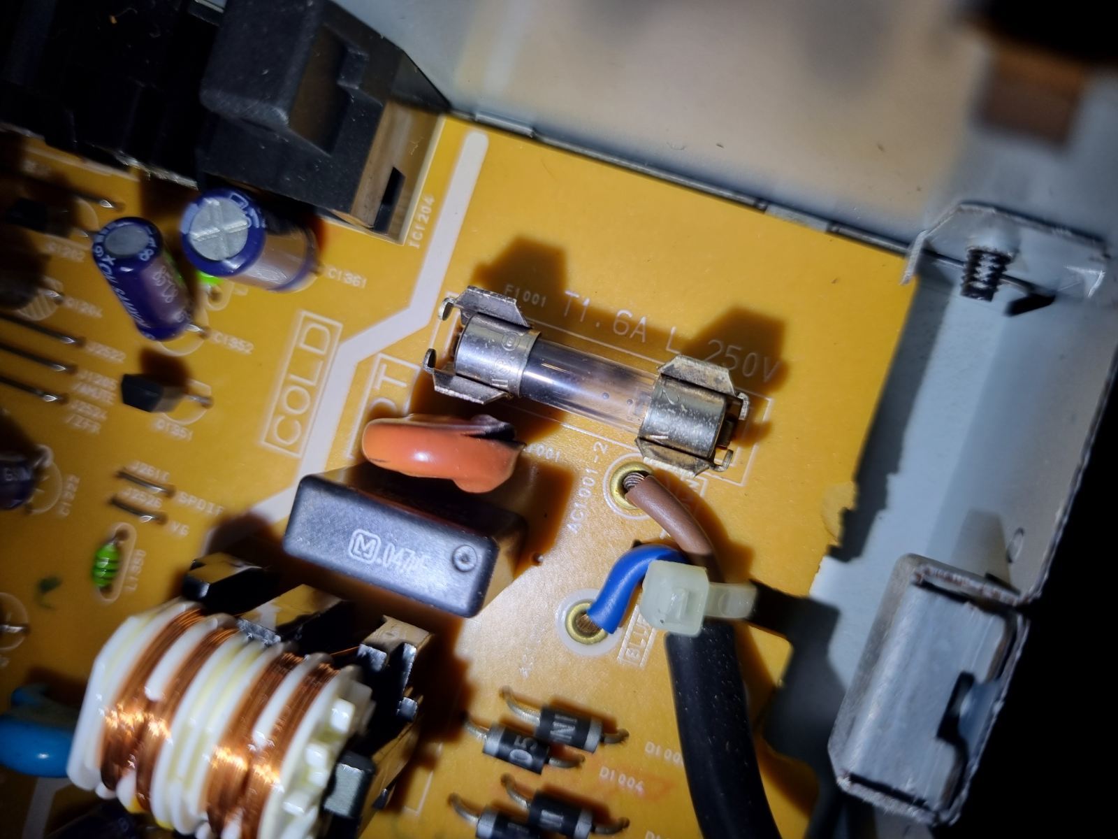 Blown fuse and capacitor in the DVD player, I was going to use it for CDs but it looks like a complicated process to pull the board out with other multiple boards in the way joined with ribbon cables and the DVD mechanism etc in the way to get to replacing the capacitor. Might just have to bin it.