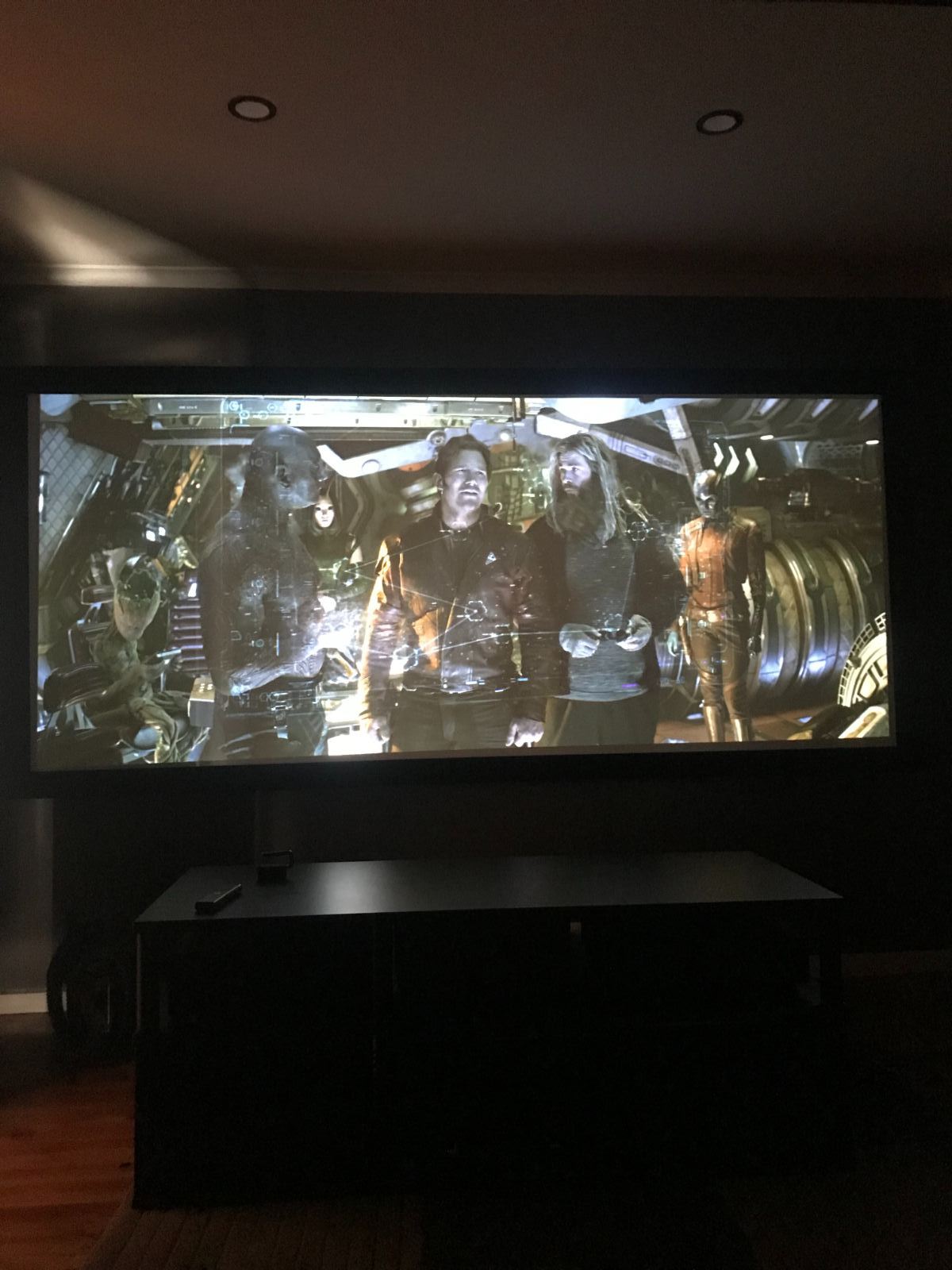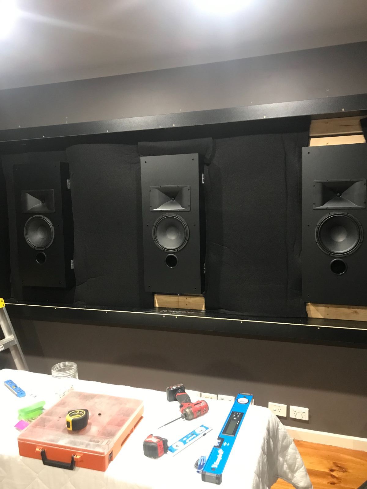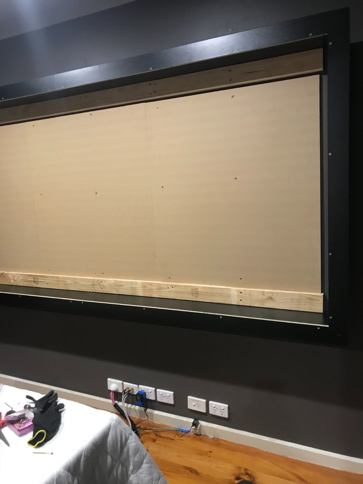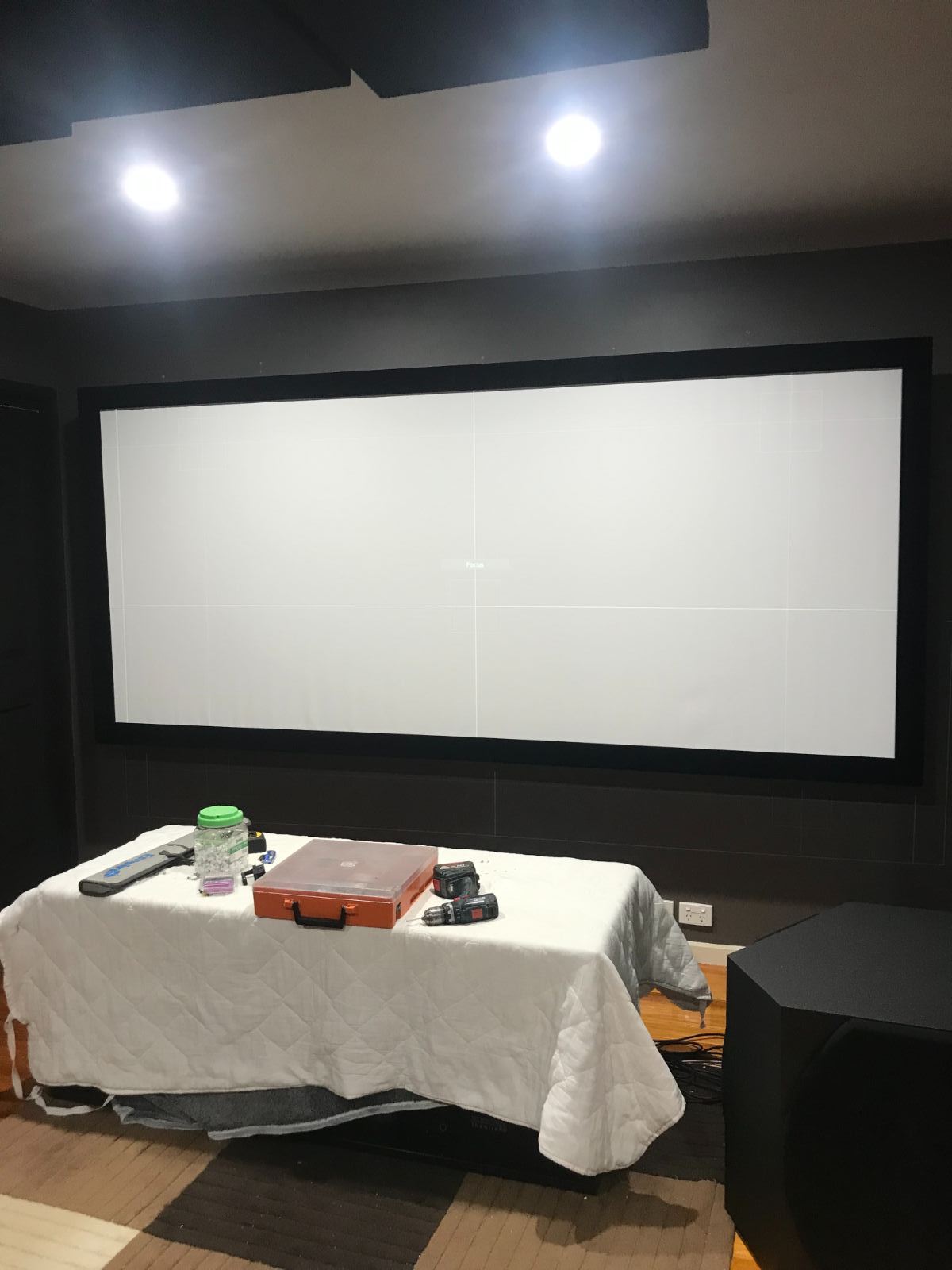 Today (Tuesday) was day one of two for the upgrade and so far it's looking amazing, and cannot praise Marc and his partner for their attention to detail and workmanship. It's been a seemless transition so far and I'm blown away with how it's looking. Just a few more things that need doing such as a new projector mount and routing of back surround speaker cable etc. We put up an image to make adjustments to fill the image on the screen, the new mount will make this happen today. Will post final pictures tomorrow at some stage as I need to recalibrate the system for the audio tomorrow night.
