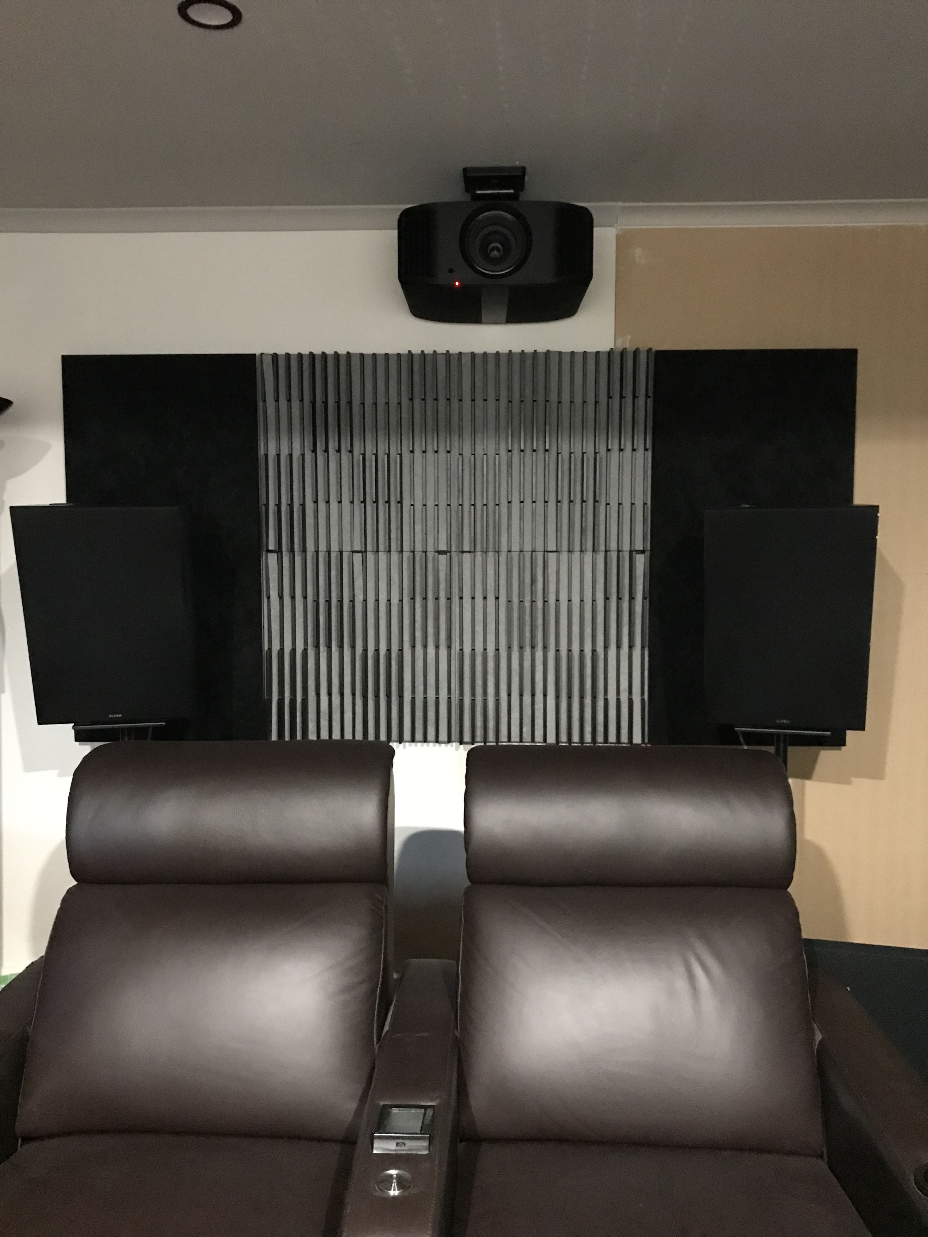 Hey. Just an update on the setup, as I took delivery of a pair of Megaphonix On-Wall speakers (pair) for back surround duty. Complete overkill but thats how I roll and now the audio side of things is complete (maybe). These are replacing a pair of JTR Slanted 8's which are going to a mate. Big size difference and boy do they deliver the sound. I know they are closer to the main listening position but thats due to room limitations but they are forward of the rear Atmos ceiling speakers as much as can be and the back wall. The front seats are now approx 3.4m from the screen (120"). Calibration has been done and I watched A Quiet Place (first one) and it sounded incredible. The Trinnov really does a brilliant job of blending in all the speakers, but the system does need a professional calibration and that will come after I've sorted out some room acoustic panels to replace existing ones. The journey continues.
