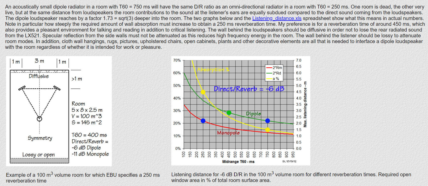 It is true the designer of my speakers posited that 450ms was an ideal rt60 and I do wonder about that. He was trying to say that with his speakers which offer a higher direct to reflected ratio than monopoles the effect of reflections were less on the perceived listening.  One benefit of which is that lower room reverb times are not as important, so indeed at 450ms the Linkwitz speakers will cope much better with room reflections than monopoles that fire of a lot of energy to the sides and I think this was the point he was making. Also I think that it depends on the music you listen to. If you predominantly listen to classical recorded in concert halls the reverb times are much (hugely) greater than those in a damped studio and 150-200ms might not make that much difference to the sound of those recordings and maybe make it sound more real. I dont know.