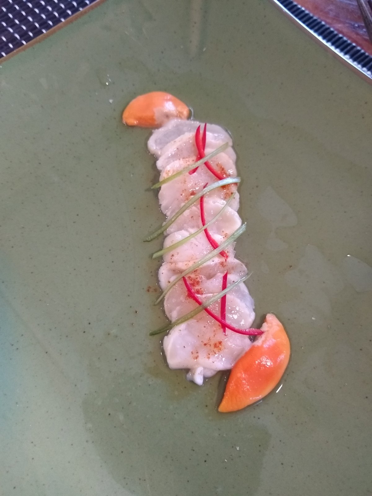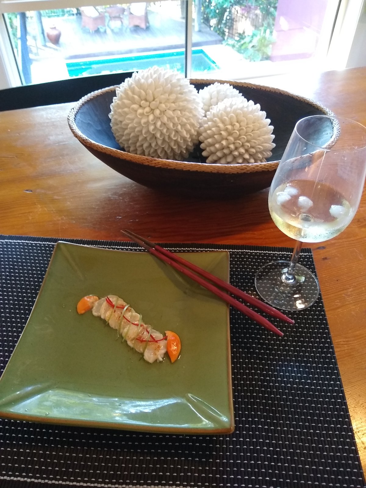 Fresh Tassie scallops and locally caught school prawns (this afternoons runout tide) 2 hours out of the water. Bottle of pinot grigio and squeeze of lemon and let the scallops sit in the juice with a brush of chilli powder until the citric cooks them. Very sharp knife and double sashimi  thickness for the scallops with a flick of pepper and salt to finish off.