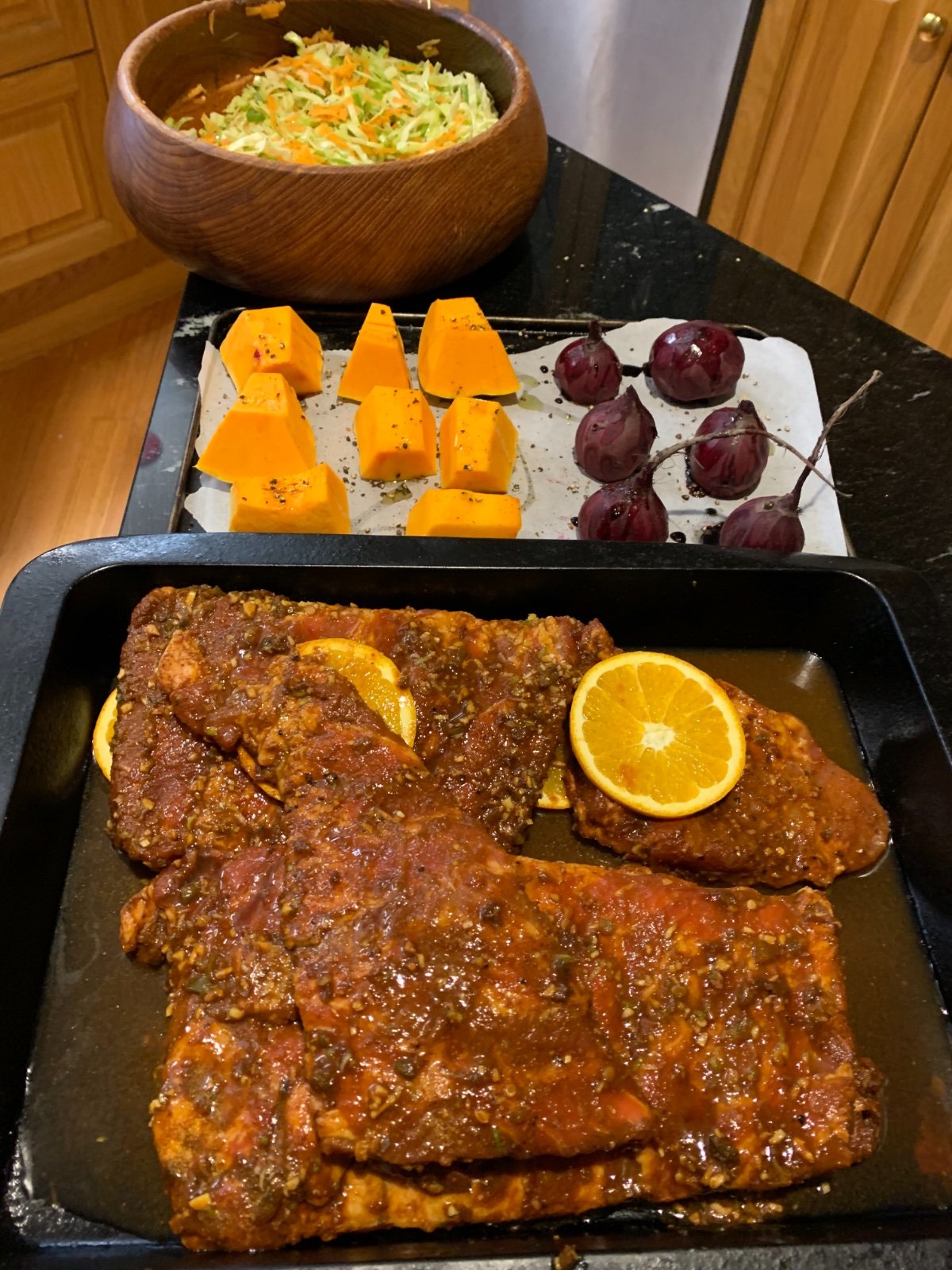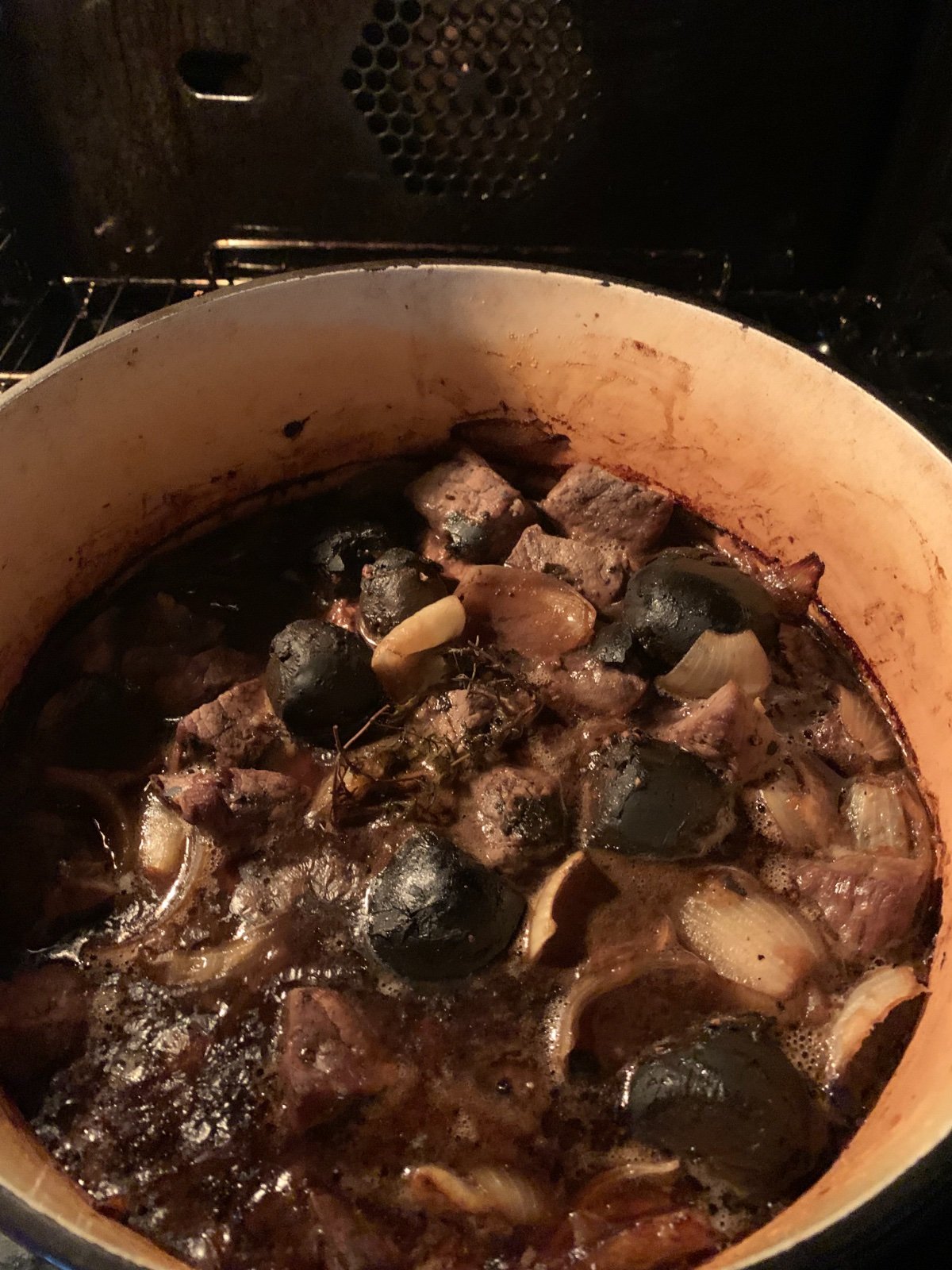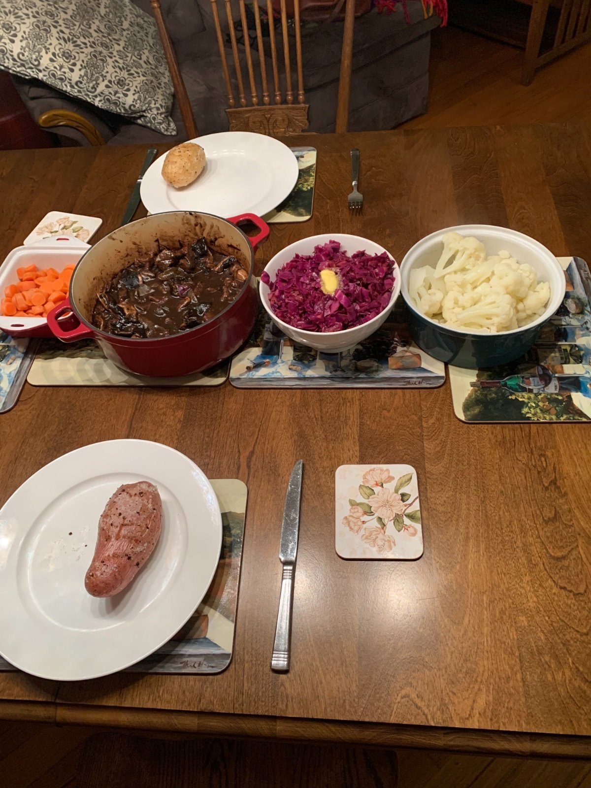 Braised beef in Guinness with pickled walnuts (hard to find). Accompanied with Baked potatoes (in jackets), Red cabbage with ginger/garlic/balsamic vinegar and rounded out with steamed carrots and cauliflower.