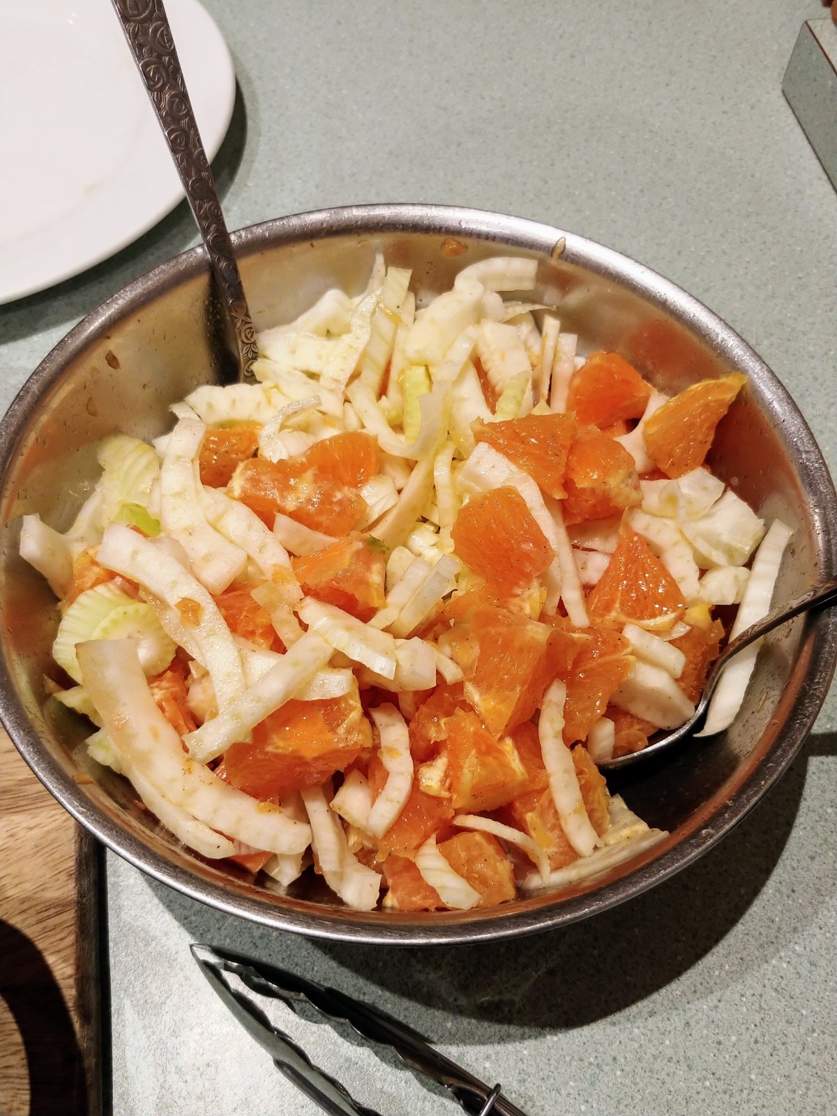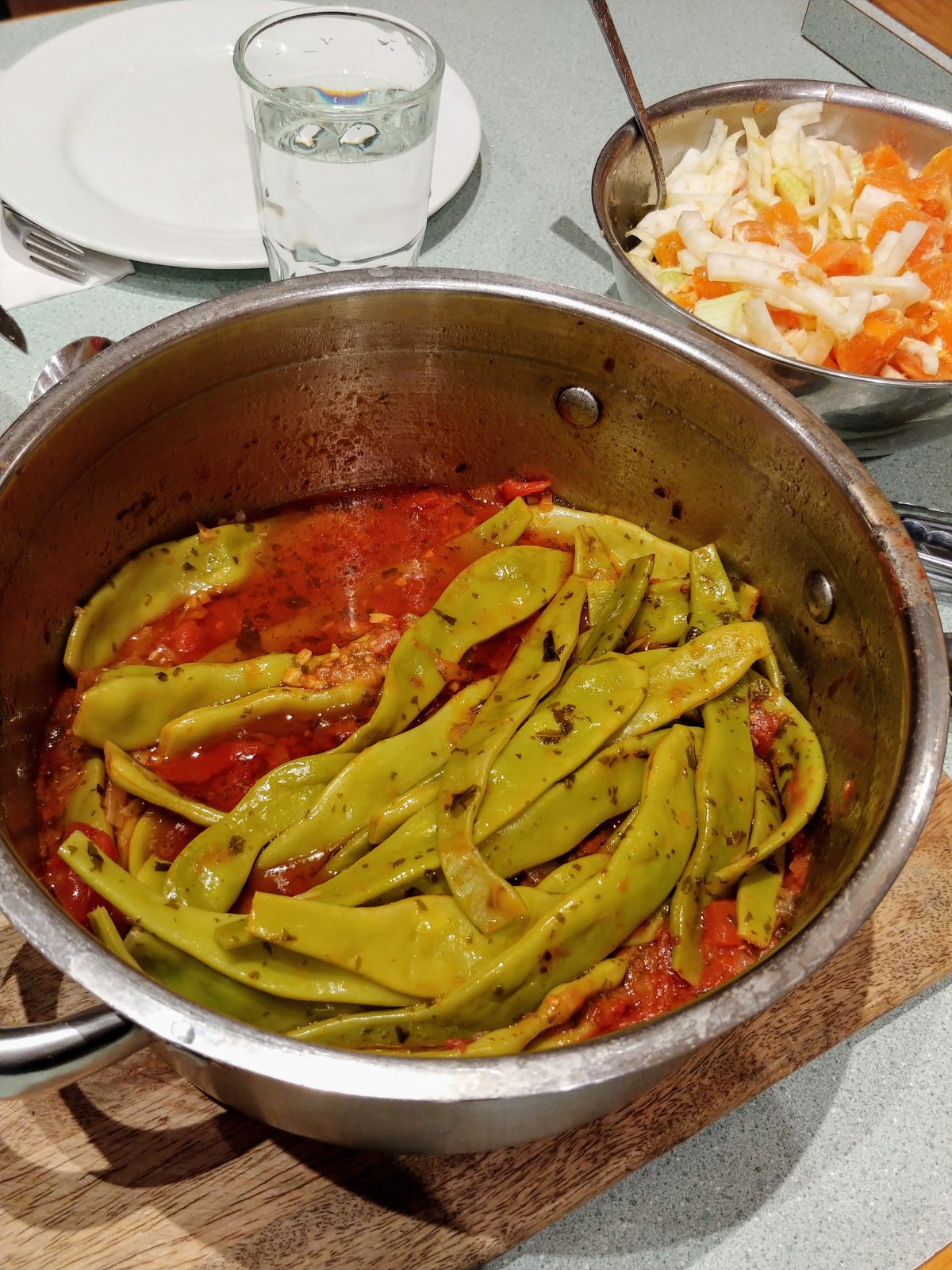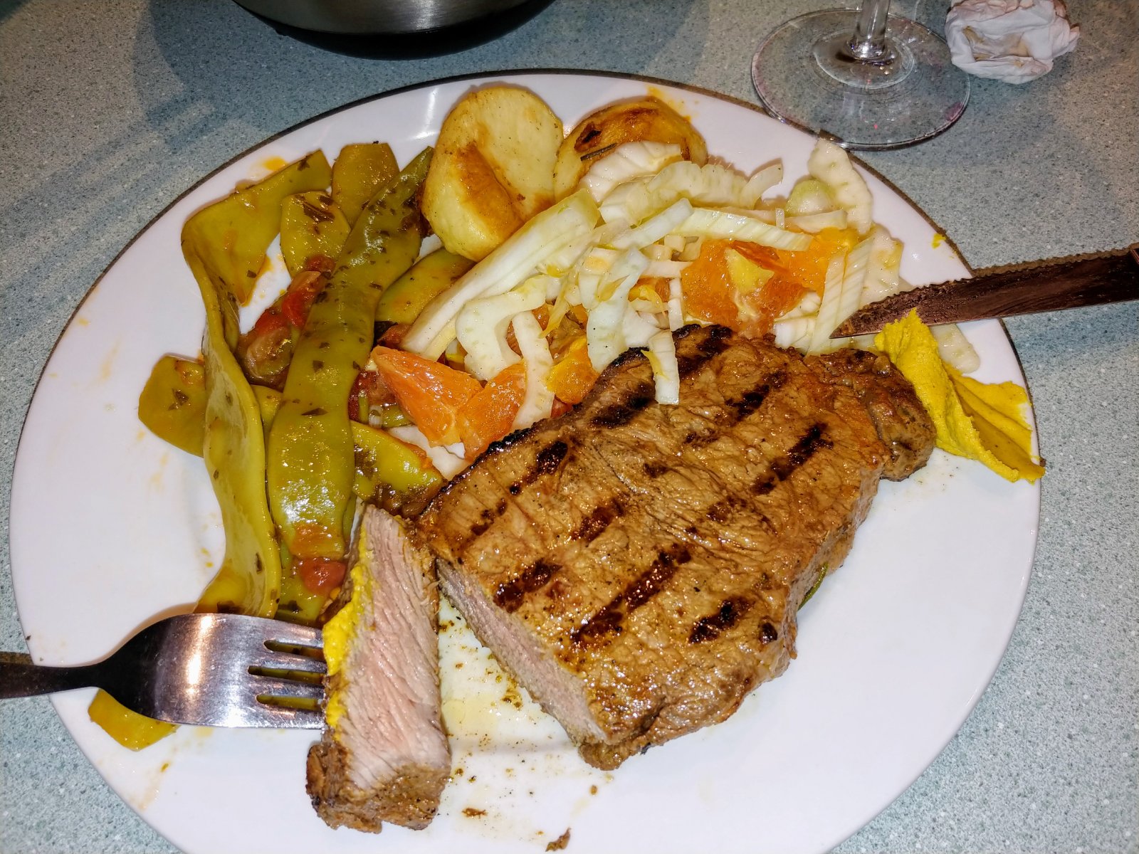 Some lovely scotch fillet, beans & peeled tomato with galic, roast potatoes, & a fennel & orange salad. With some wine of course....