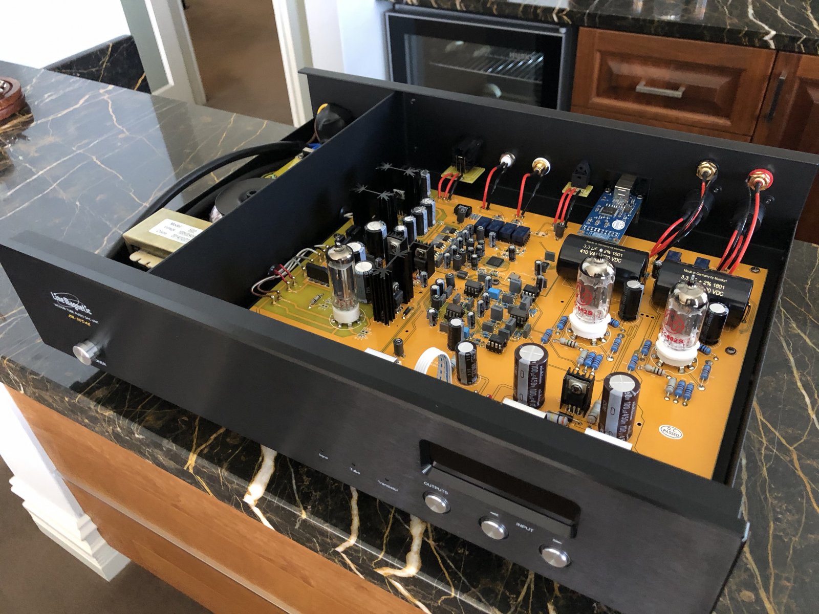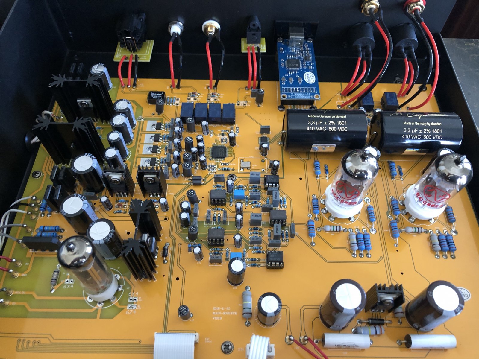 Checking out the various valves inside it uses 3 JJ ECC803s valves and lots of Mundorf caps. Some shots below.