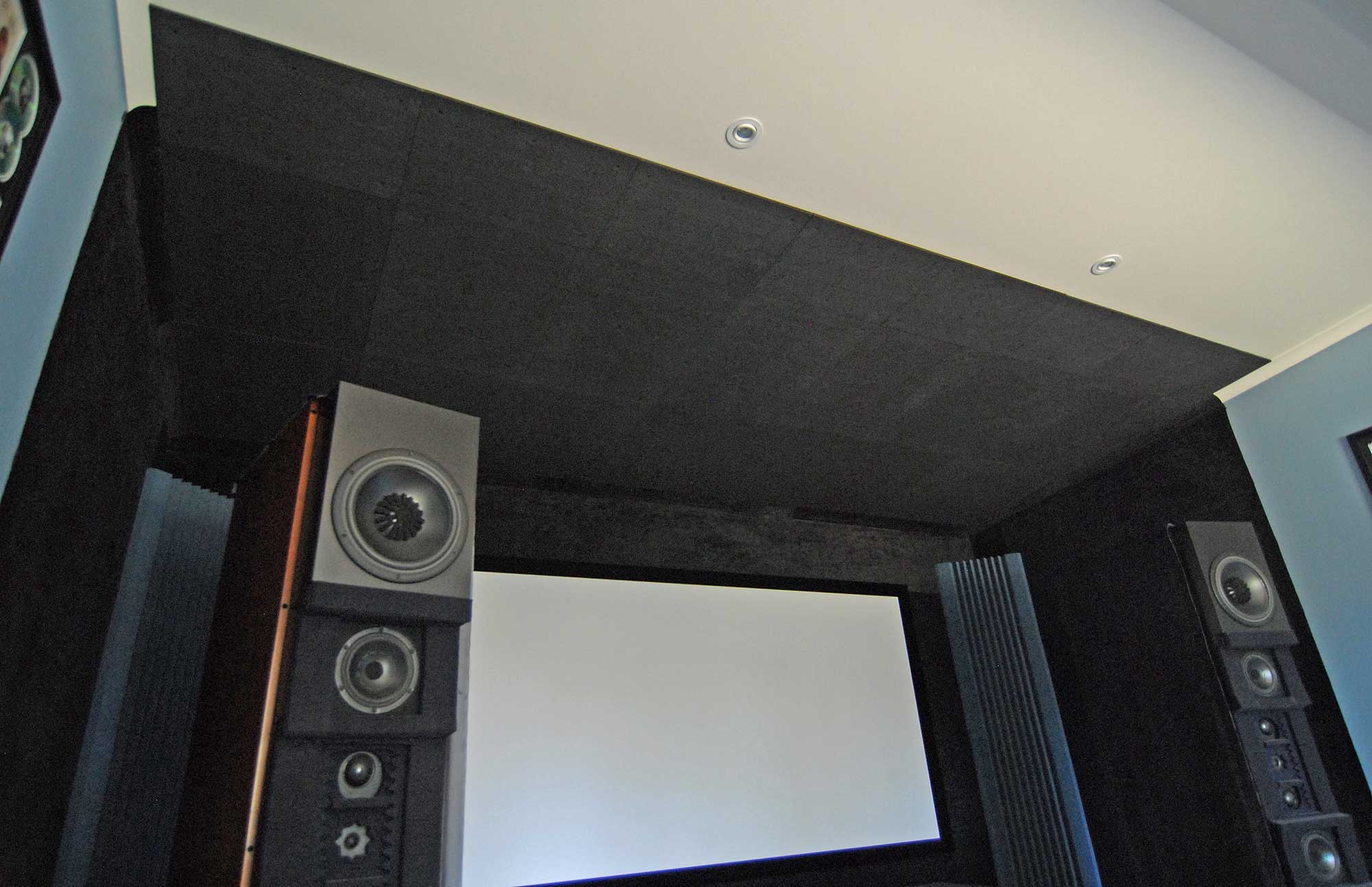 • Finally fished my panels for the roof section. Panels are 900x800 and 12mm thick acoustic , i had these flock coated matt black. These protrude 2.25mtrs from the back wall minimizing reflections on th